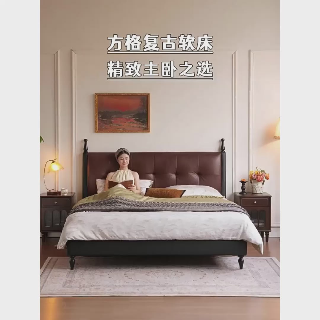 Genuine Leather Elegant Soft Backrest Bed, French RetroGenuine Leather Elegant Soft Backrest Bed, French Retro