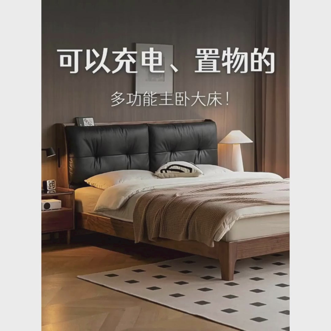 Black Walnut, Sandalwood Solid Wood Bed — Genuine Leather Upholstered, Simple Luxury Design