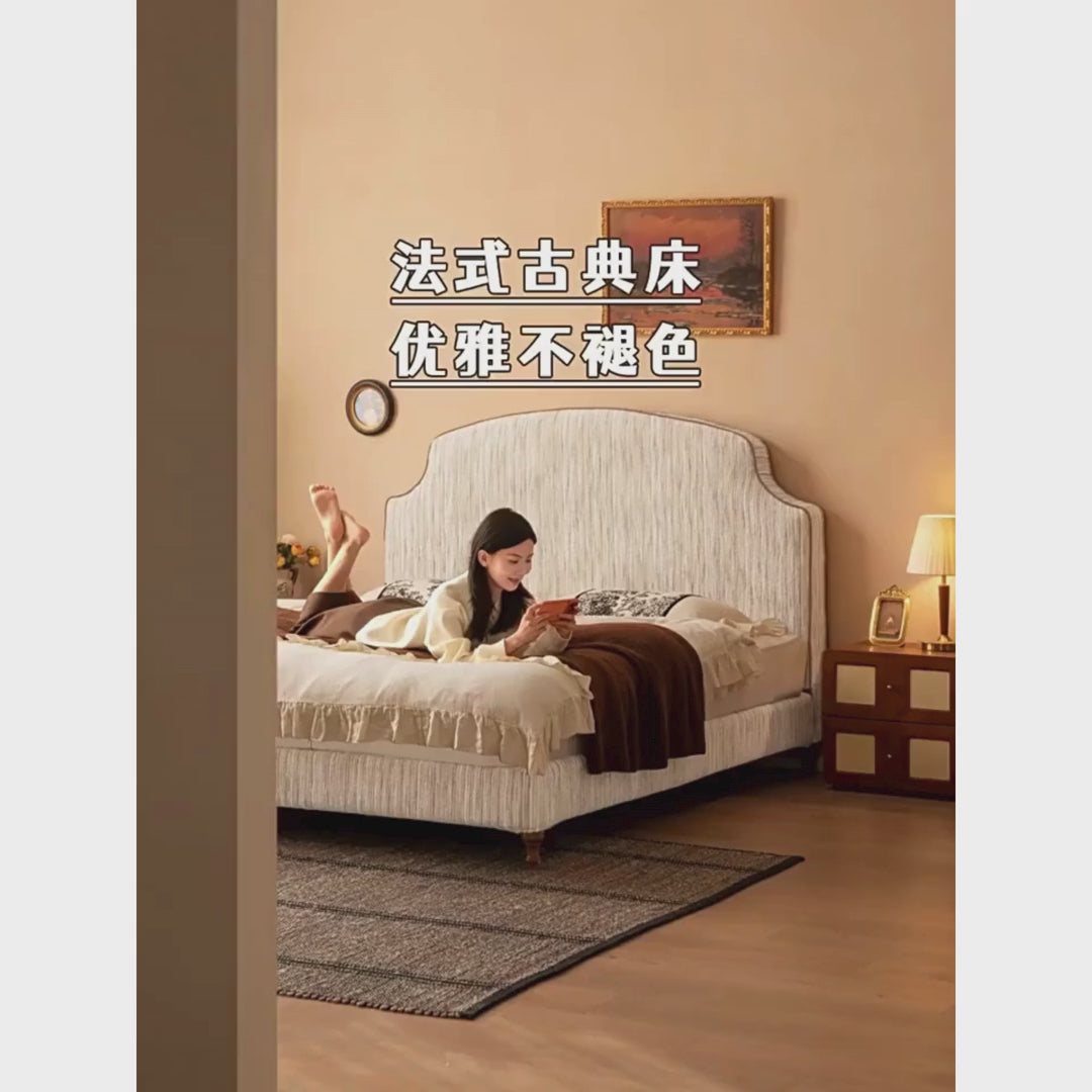 Poplar Solid Wood Bed – French Retro Design with Soft Fabric Upholstery