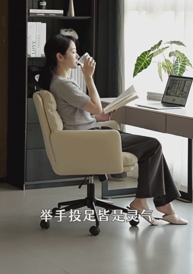 This office chair features a sturdy iron frame combined with three layers of solid wood for durability. It is padded with high-density sponge and doll cotton for comfort. The chenille and eco-friendly cloud leather fabric is fixed and cannot be removed or washed, and the cushion is non-removable.