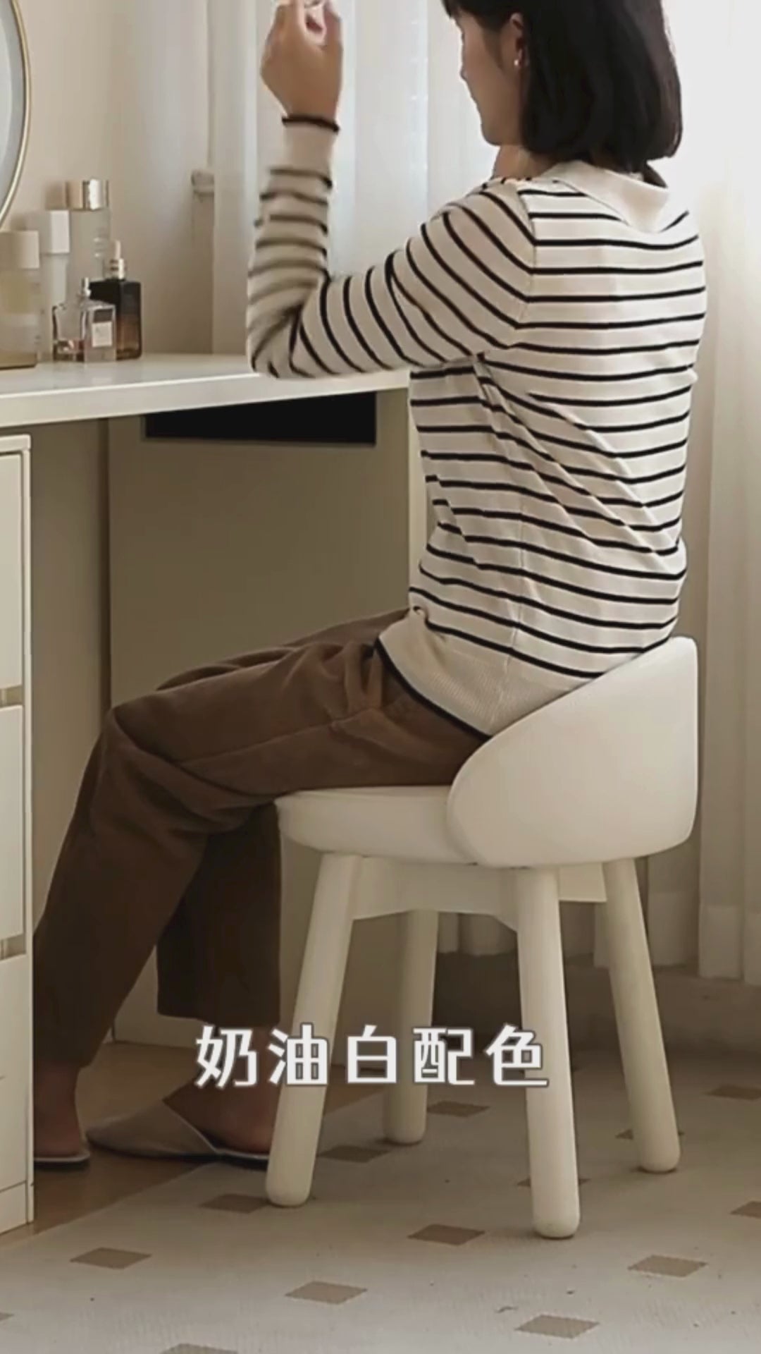 Pure creamy white A touch of tenderness in front of the dressing table The clean color scheme will never get tired of you. The white color is classic and versatile, and can be easily adapted to different dressing tables. 360° free rotation Makeup removal so easy There is a turntable base under the seat, which can be rotated 360°. You can easily access items from all over the table with just one turn without getting tired at all. Cloud soft leather fabric 3 Easy to take care of and worry- free The makeup stool is used almost every day, so it is important to choose the right fabric. Cloud soft leather is not only comfortable to the touch, but also stain- resistant and wear- resistant, so there is no need to take care of it.