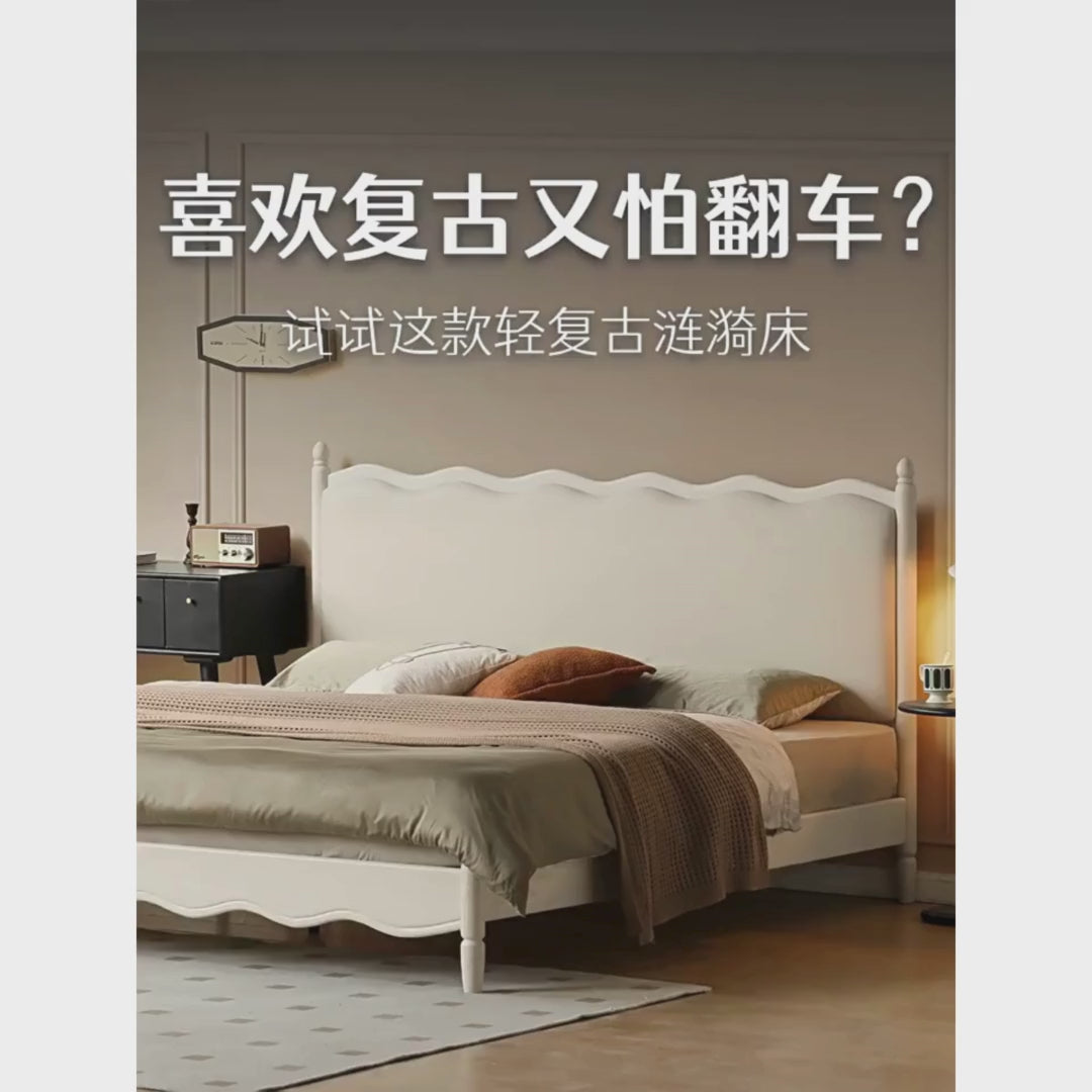 Rubberwood Solid Wood Upholstered Bed Retro Style White Bed