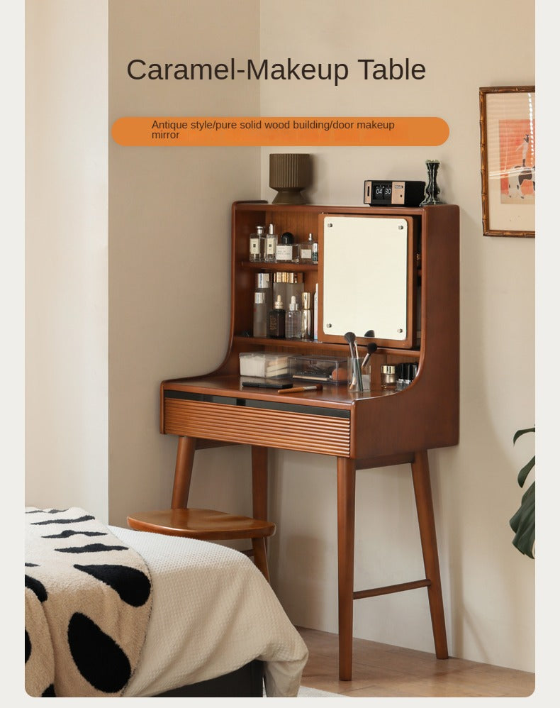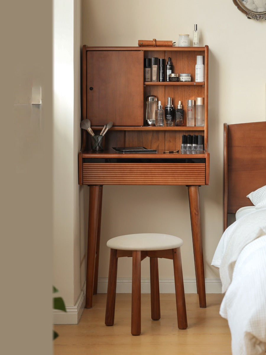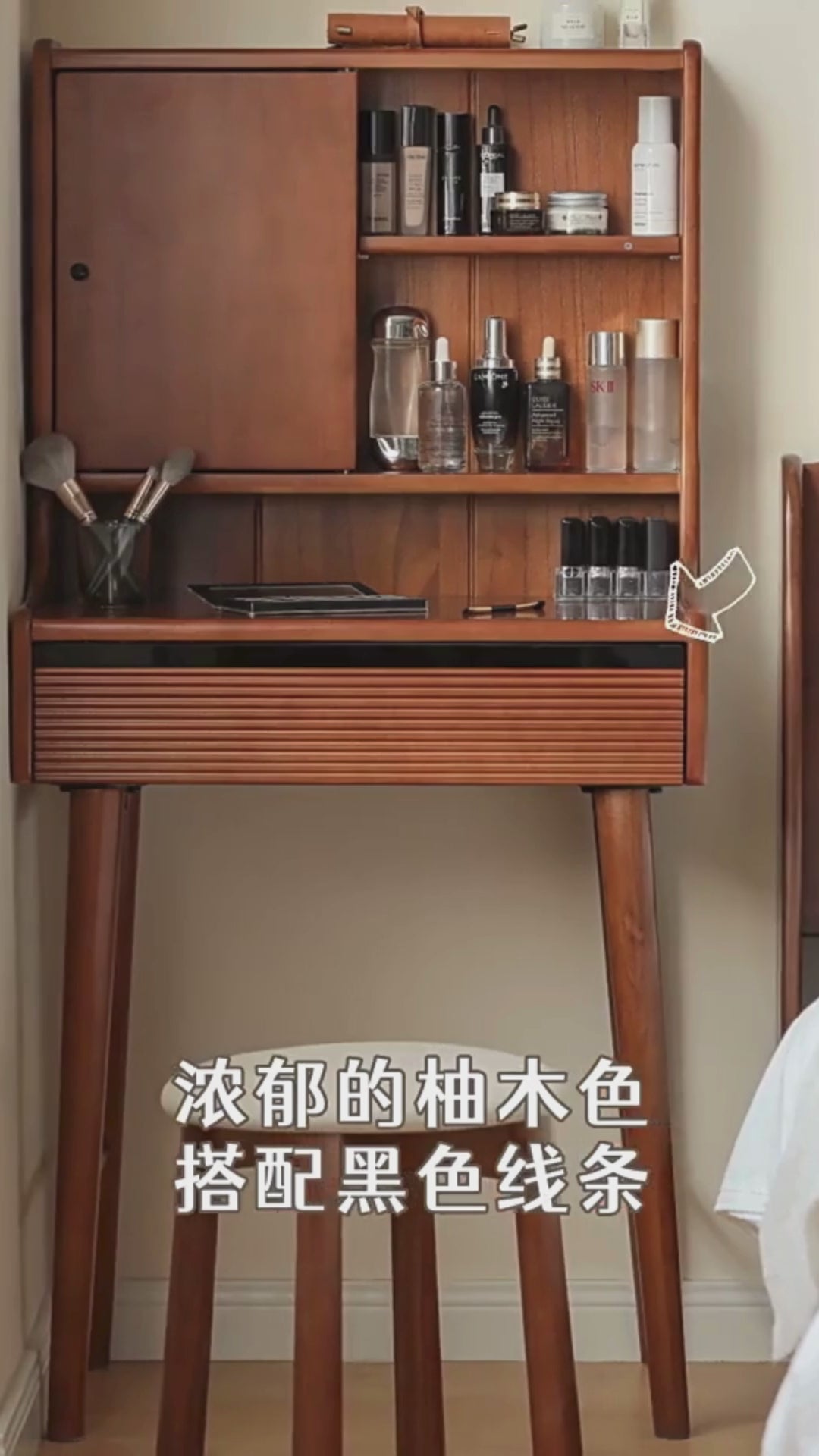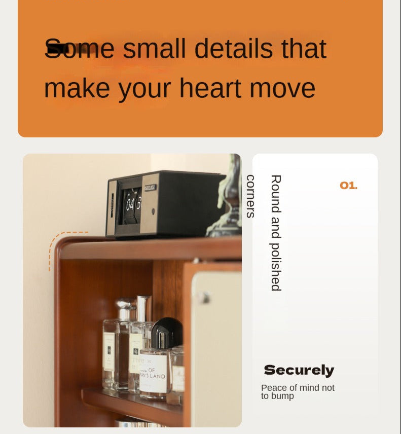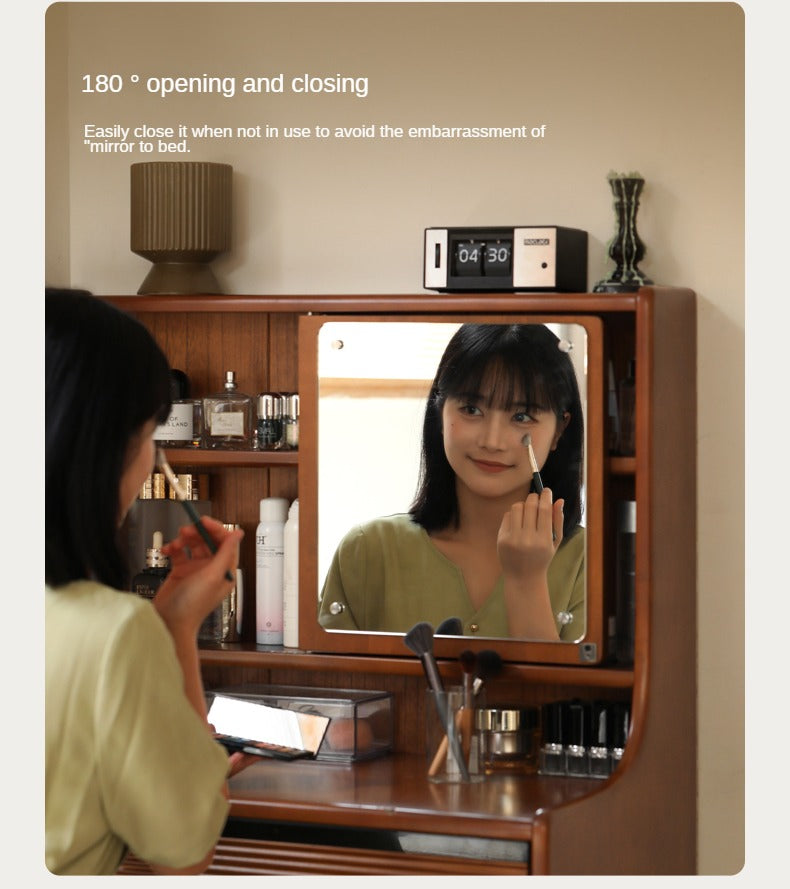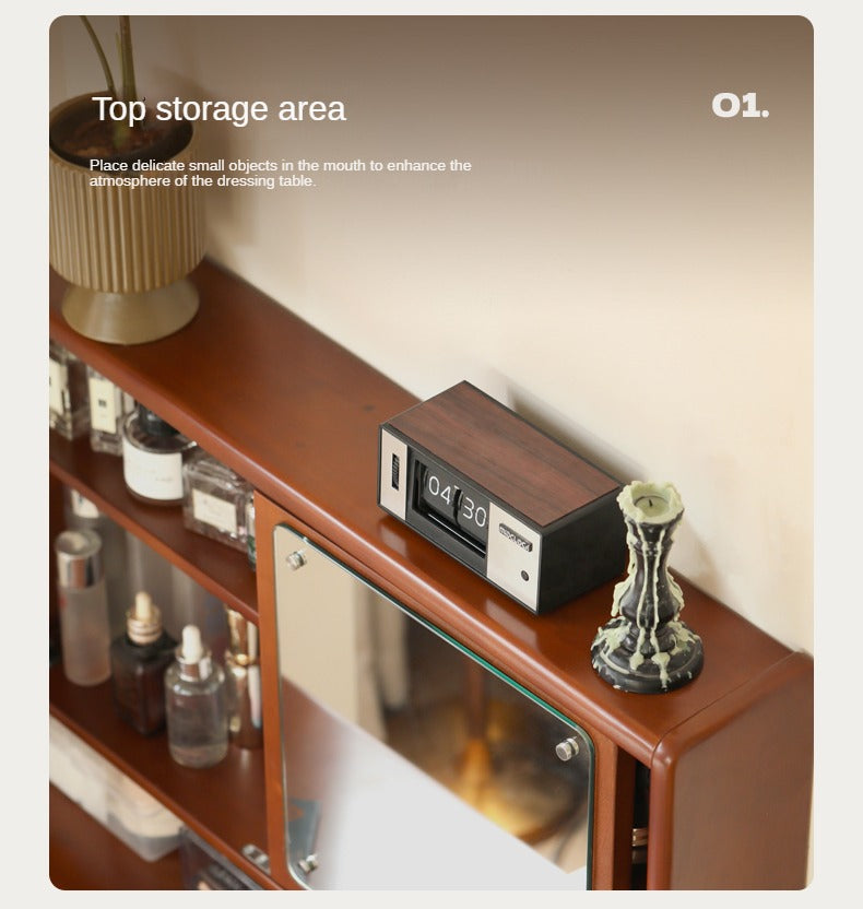 Good looks, more eye- catching! The rich teak color is combined with smooth black lines, which is retro and fashionable. Open grid = your skin care area Suitable for commonly used skin care products, double- layer storage compartments are placed in categories. The movable shelves can be adjusted in two levels, making the storage height more flexible. Hidden flip- up makeup mirror 180° opening and closing When placed at the end of the bed, it can avoid the embarrassment of "the mirror is not on the bed". When placed side by side with the bed, it is less likely to get dusty when closed and is easy to take care of. Storage behind the mirror = your makeup area The door cabinet behind the mirror is more dust- proof and suitable for storing makeup.