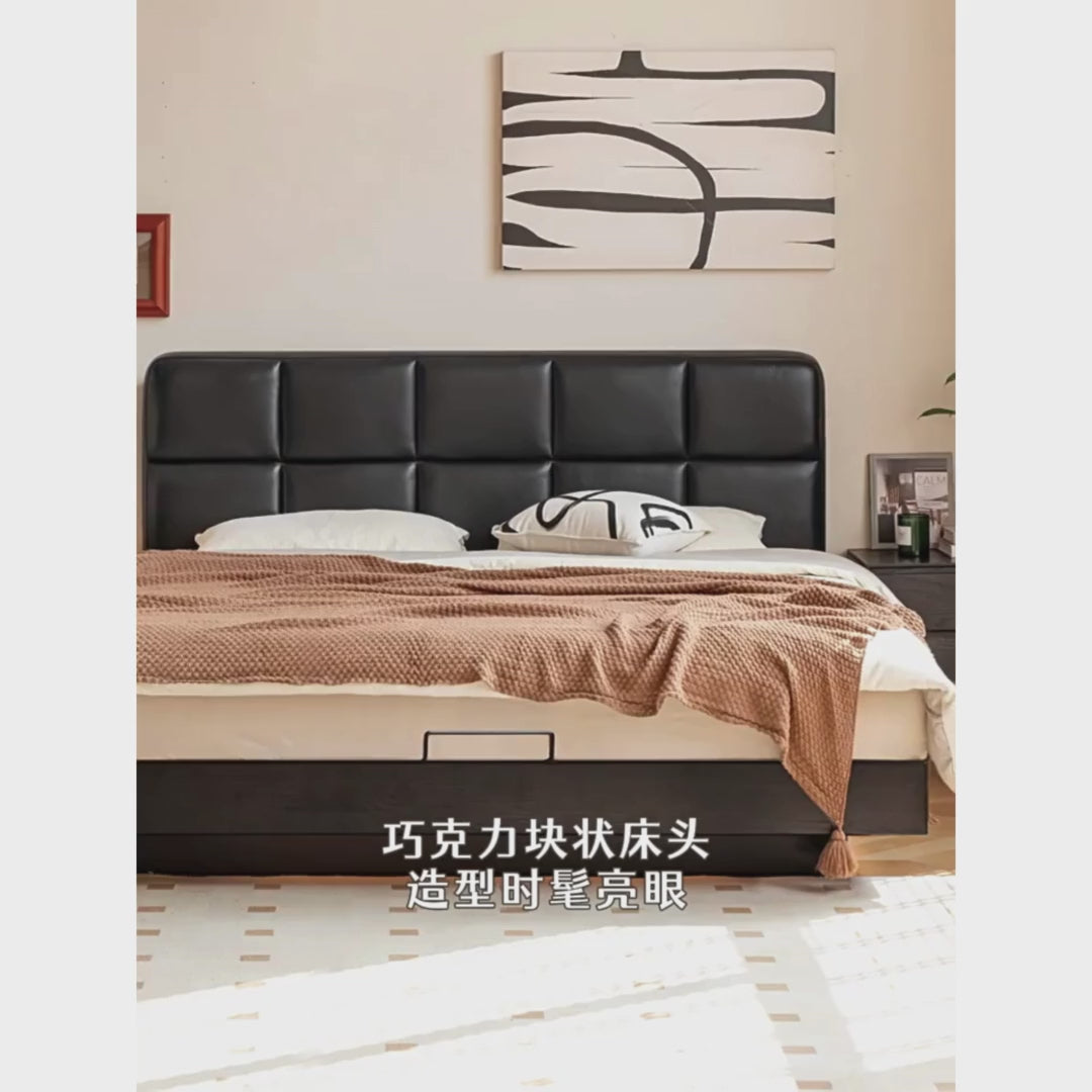 Oak Solid Wood Genuine Leather Upholstered Box Bed Retro Black Floating Bed