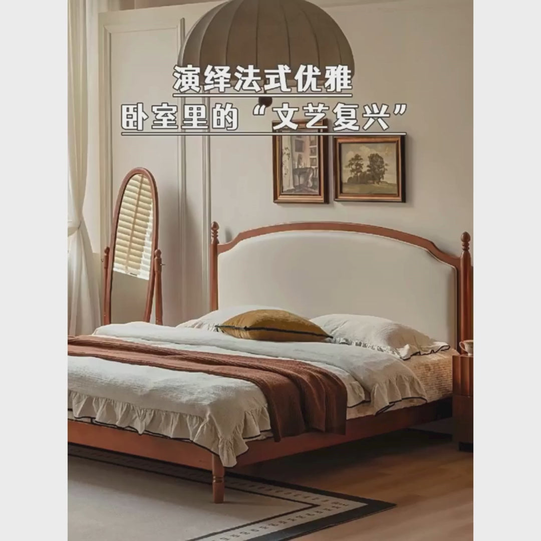 Poplar Solid Wood Bed – French Retro Design with Soft Fabric Upholstery