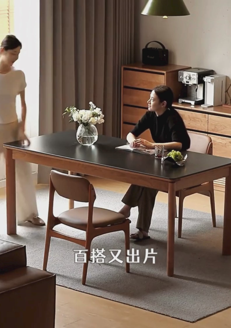 Crafted from 100% pure North American cherry wood, this dining table features elegant grain and a warm color that deepens with time. The skirt uses durable New Zealand pine for added stability. Its 1.1 cm thick pure black travertine rock slab adds a sleek, natural touch. Finished with eco-friendly oil paint applied in multiple layers, the table preserves the wood’s natural texture. Designed for durability and style, it comes with an 8-year warranty and offers nationwide delivery and installation. Please check stock availability before ordering.