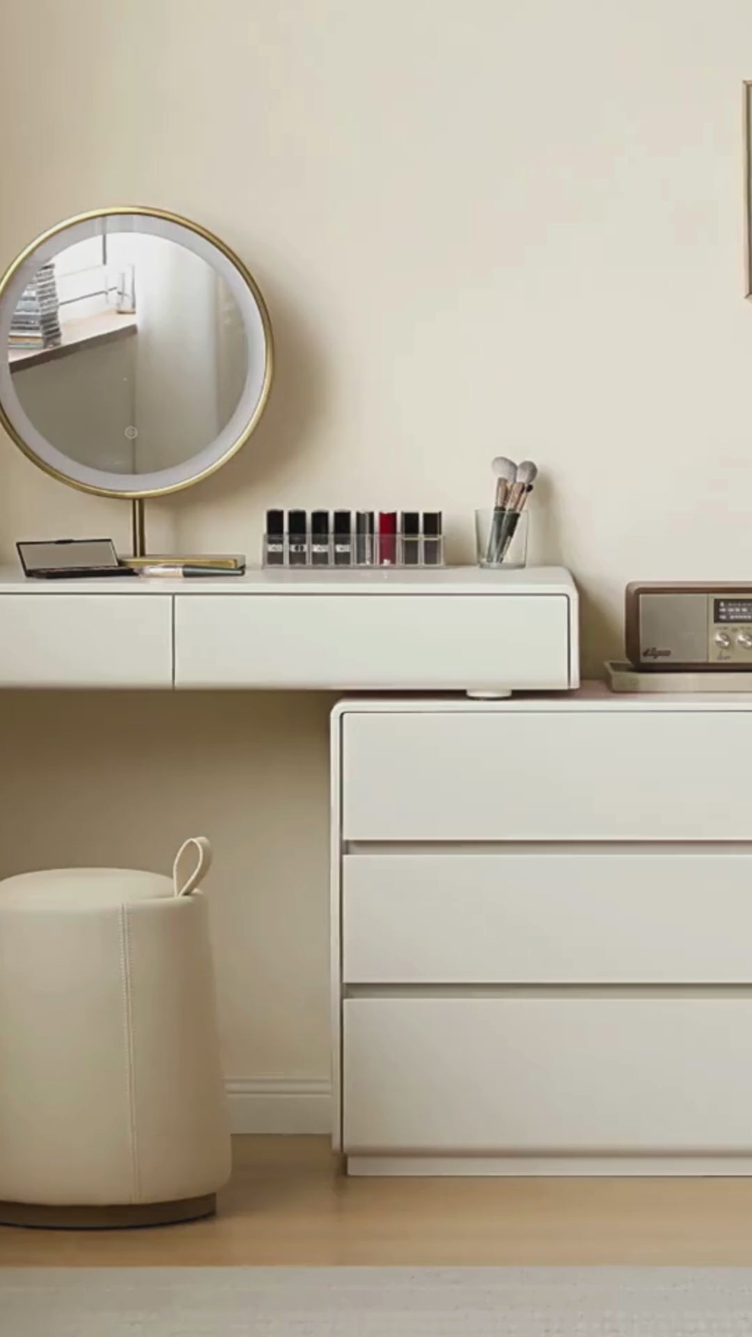 Variable font The total depth is only 40cm It does not take up much space when placed at the end of the bed/side of the bed. At the same time, the side board can be interchanged and stretched left and right. Flexible, easy to use and convenient. Variable L shape Tight fit 90° included angle Improve space utilization Not limited to dressing tables and chests of drawers Or a desk, a shelf.