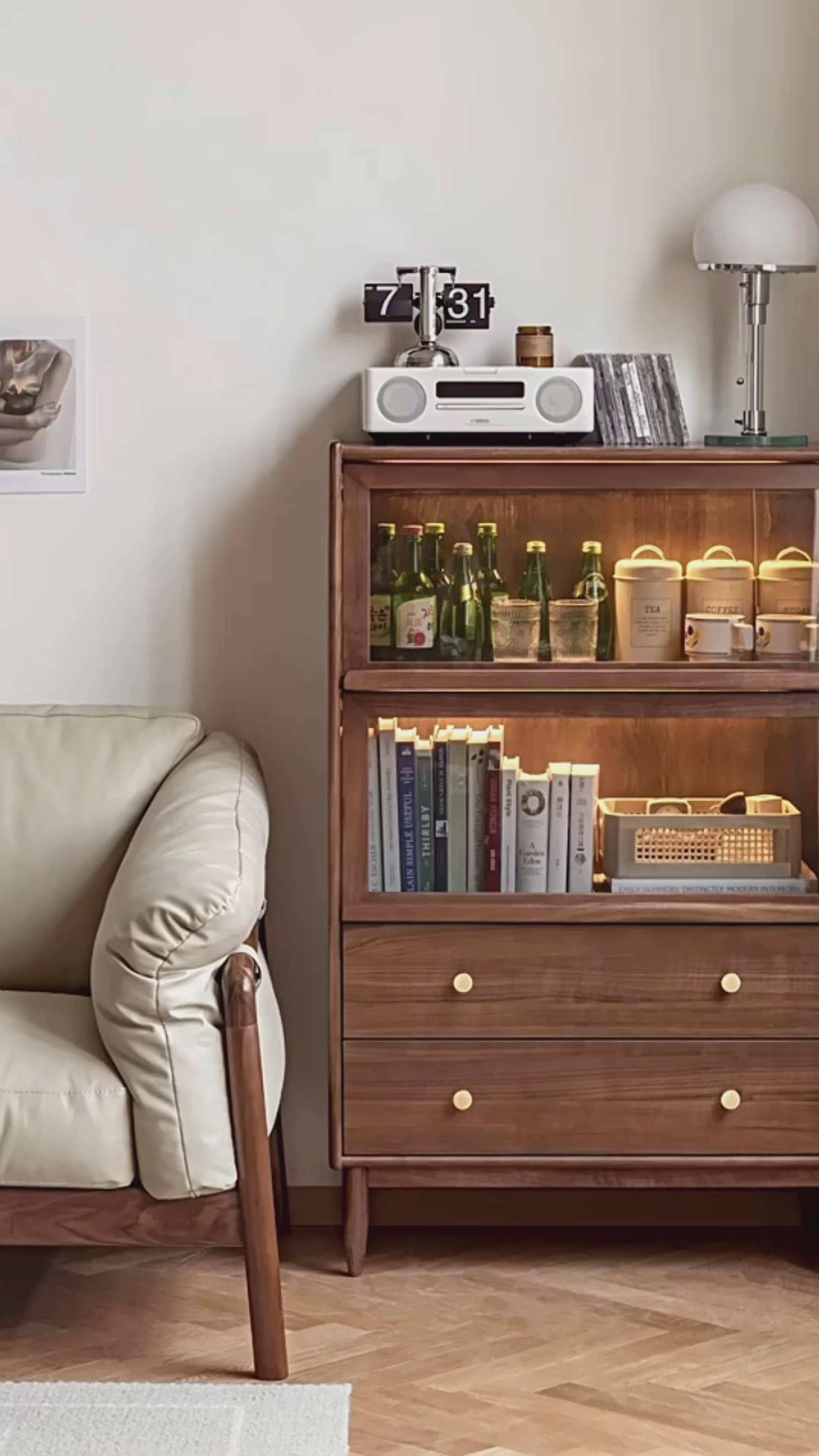 Cabinet top + flap door + drawer storage division, the layout ratio is very coordinated, the visual effect is exquisite, and it has both storage and display functions.