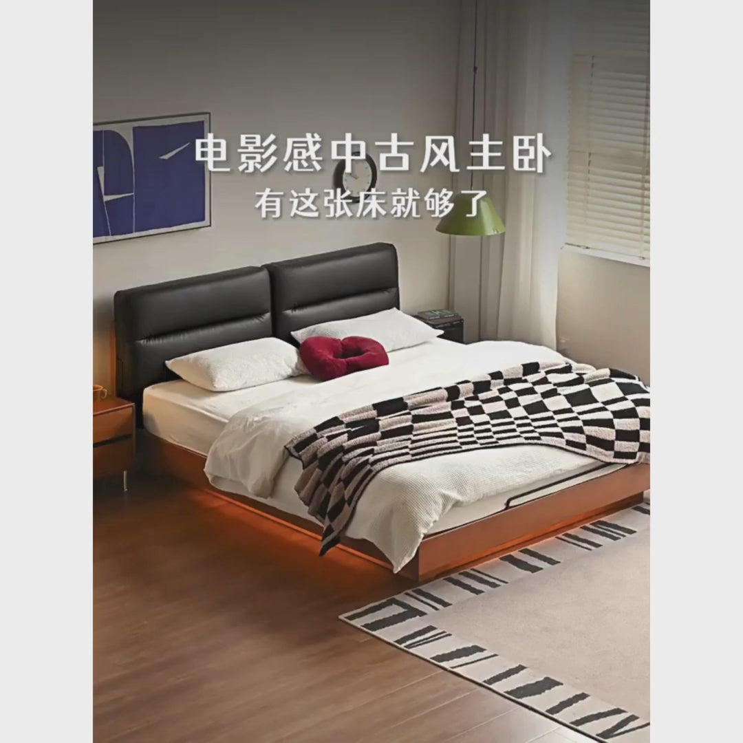 Black Walnut Solid Wood Box Bed — Soft Headboard, Italian Light Luxury Genuine Leather Bed