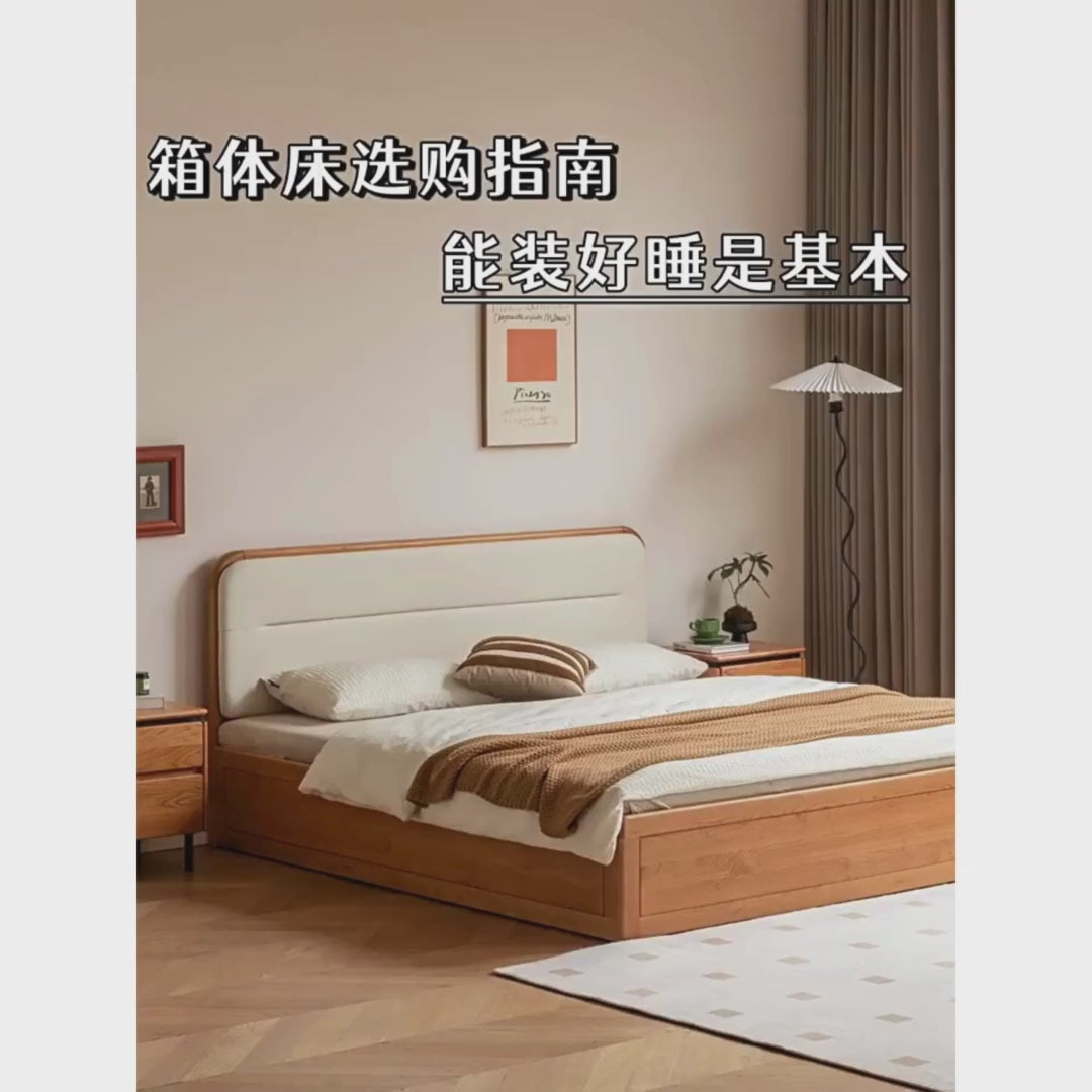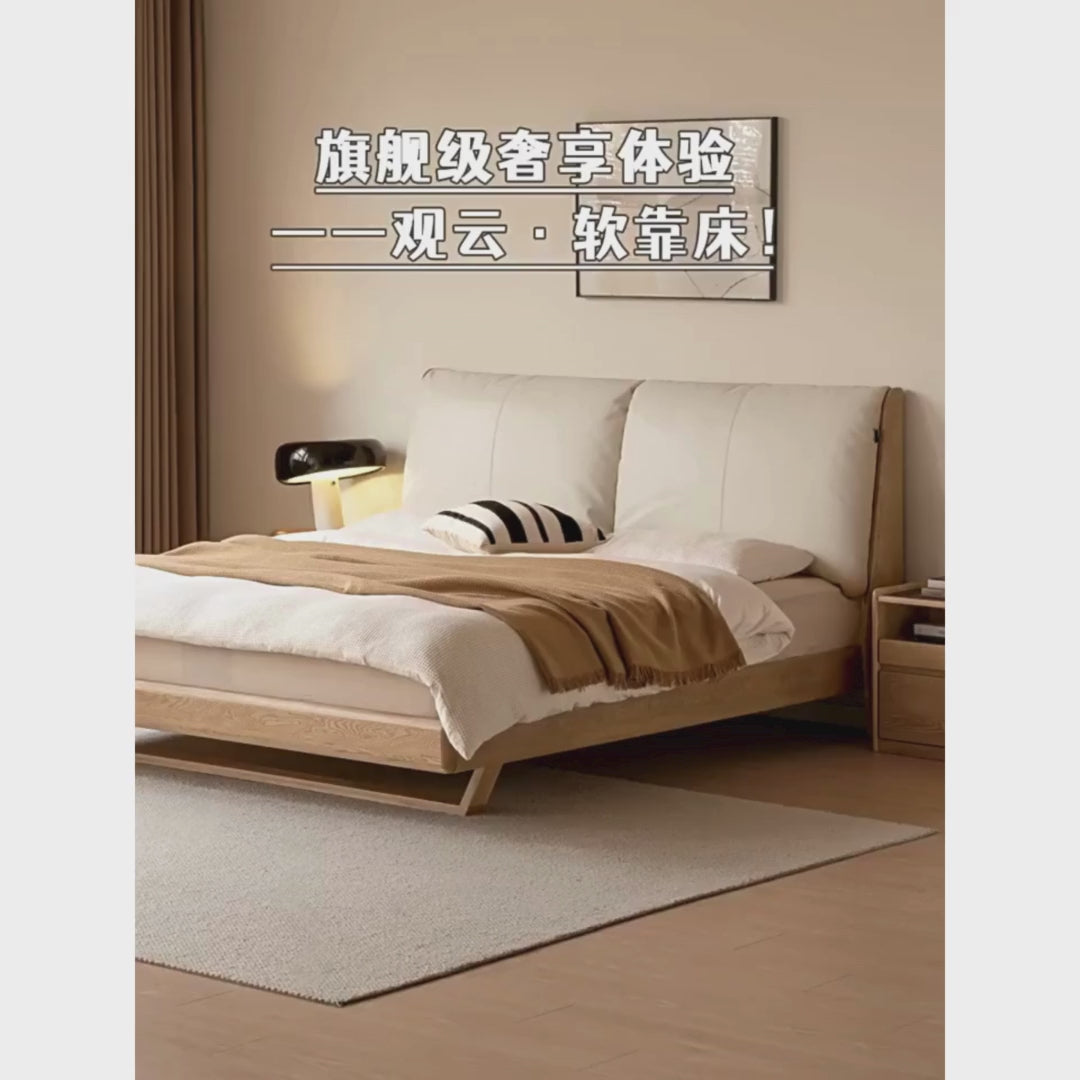 Oak Solid Wood Box Bed — Italian Light Luxury with Soft Genuine leather Backrest