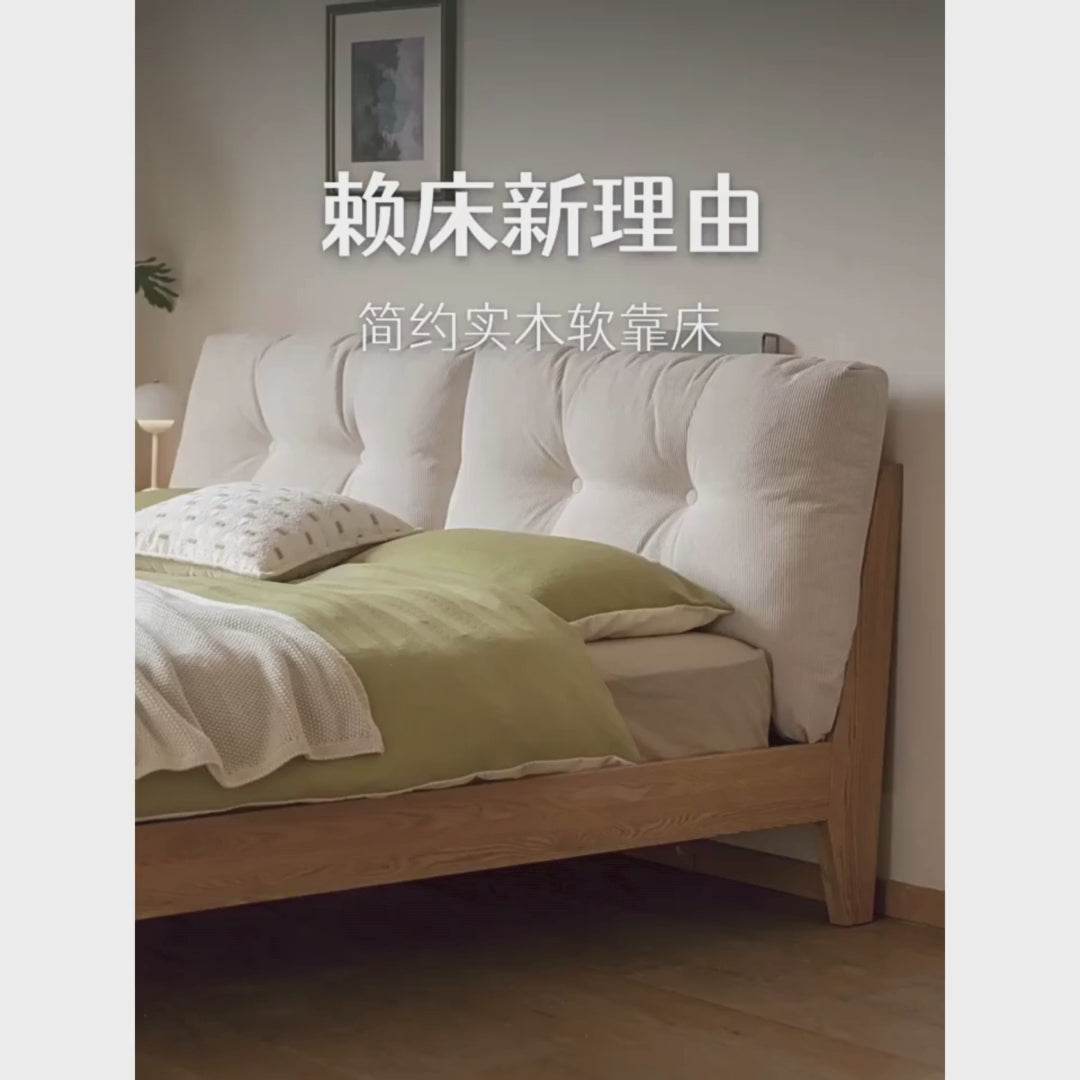 Poplar Solid Wood Bed — Upholstered with Fabric, Creamy Lambswool Soft Backrest