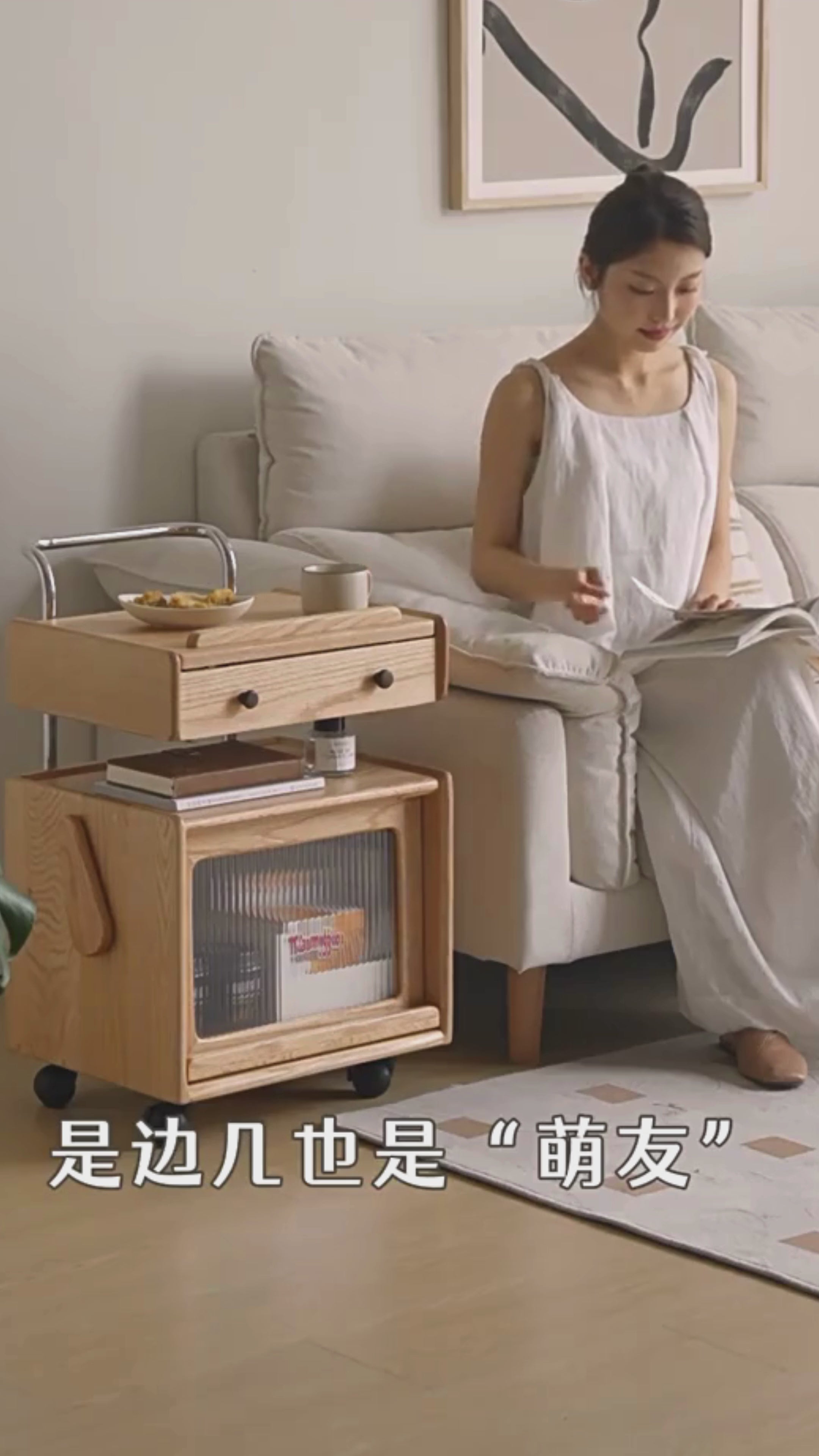 Oak Solid Wood Liftable Rotating Mobile Side Table