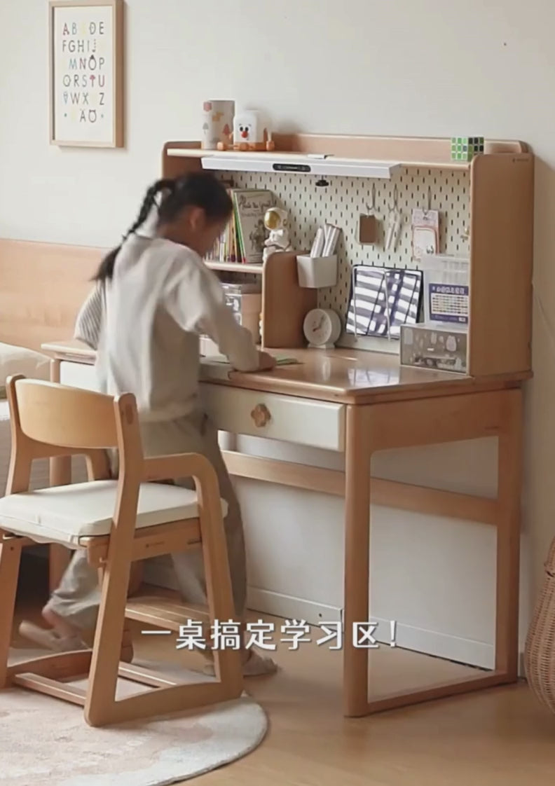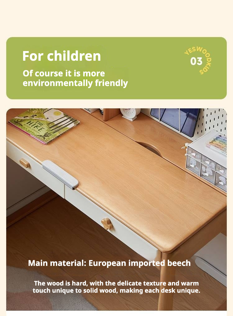 This kids' learning desk is made from 100% solid European beech wood, known for its fine grain, warm color, and durability. It includes New Zealand pine for the frame and leg pads, offering strength and stability. Paulownia wood is used for certain parts, providing resistance to wear and deformation. The white desktop surface is smooth and sturdy, designed for lasting use. A stainless steel three-section slide rail ensures smooth drawer movement. The desk also features an eye protection lamp to support comfortable and healthy study sessions.