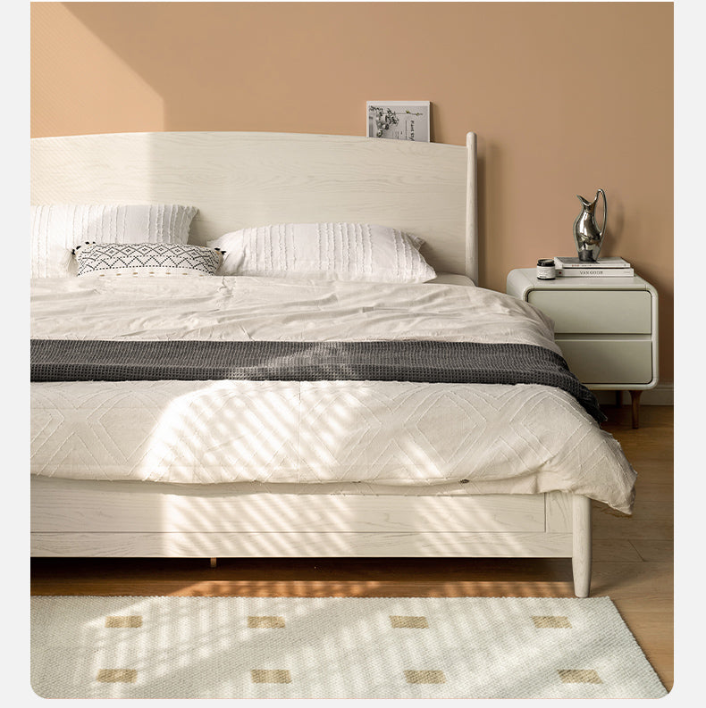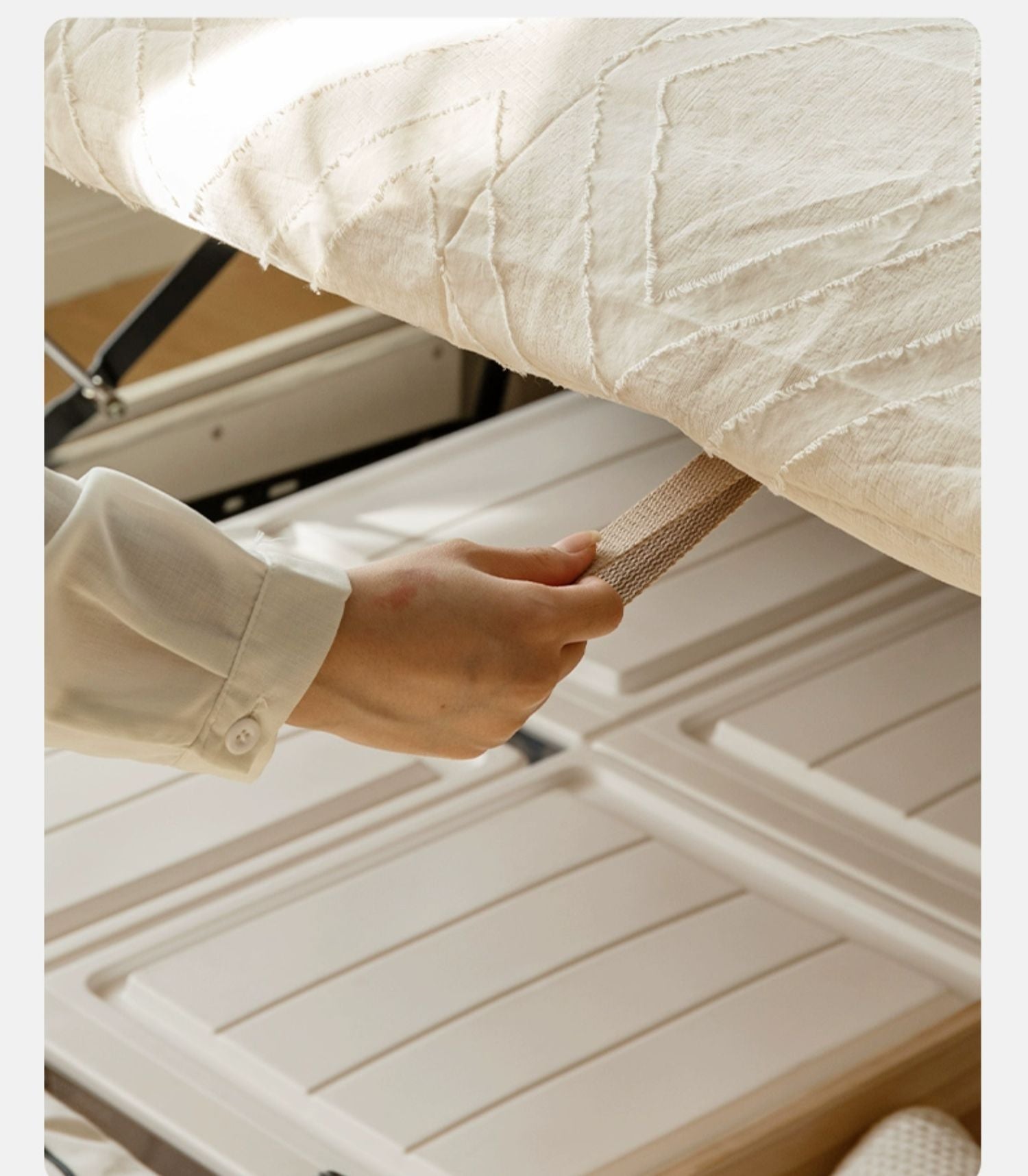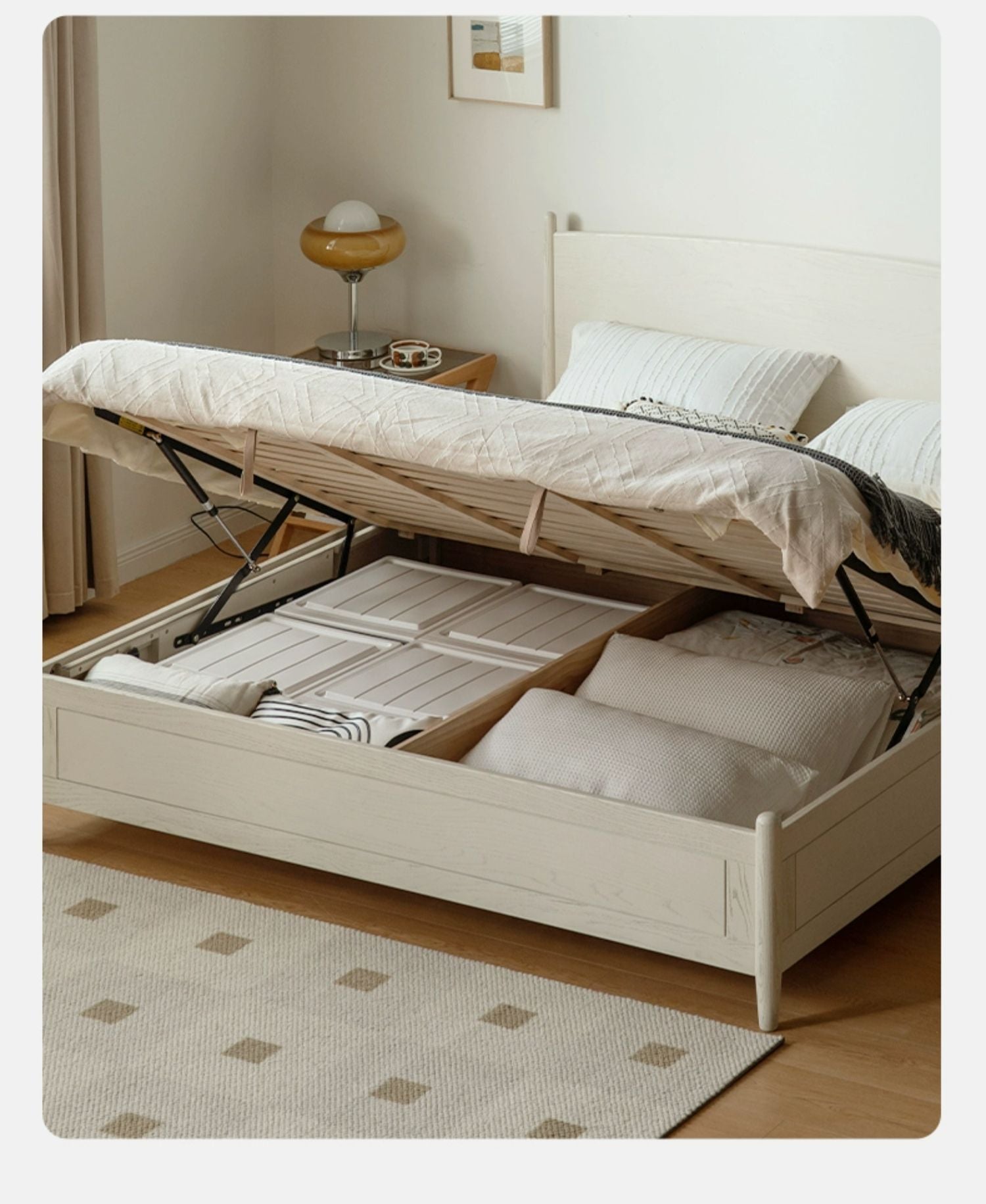 A bed with a storage capacity comparable to a wardrobe is a "strength party" and a "beauty party" The capacity of the two large boxes under the bed facilitates the storage of bedding and clothes in the bedroom The simple and soft milky white color adds a touch of warmth to the bedroom