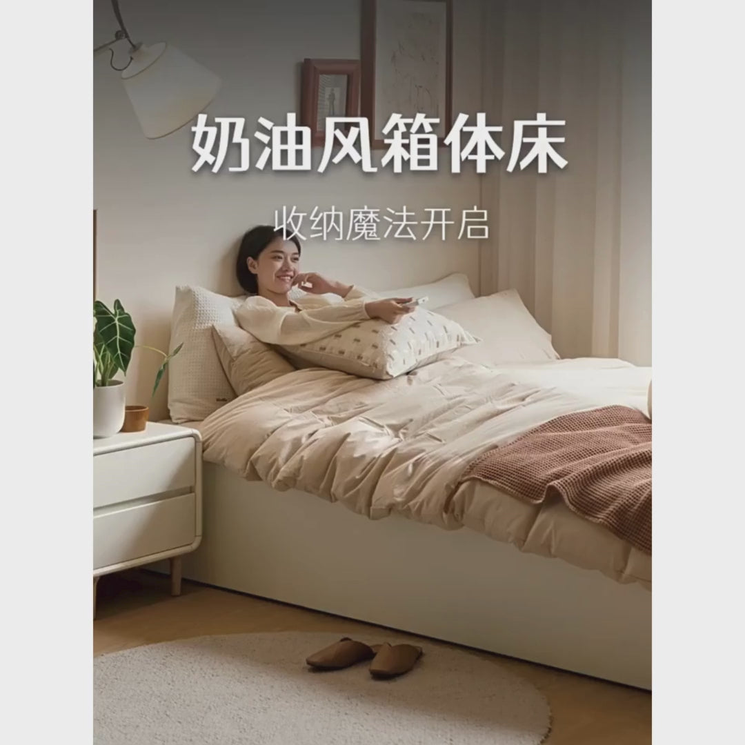 Rubberwood Solid Wood Platform Bed, Headboard-Free Box Bed Cream Style