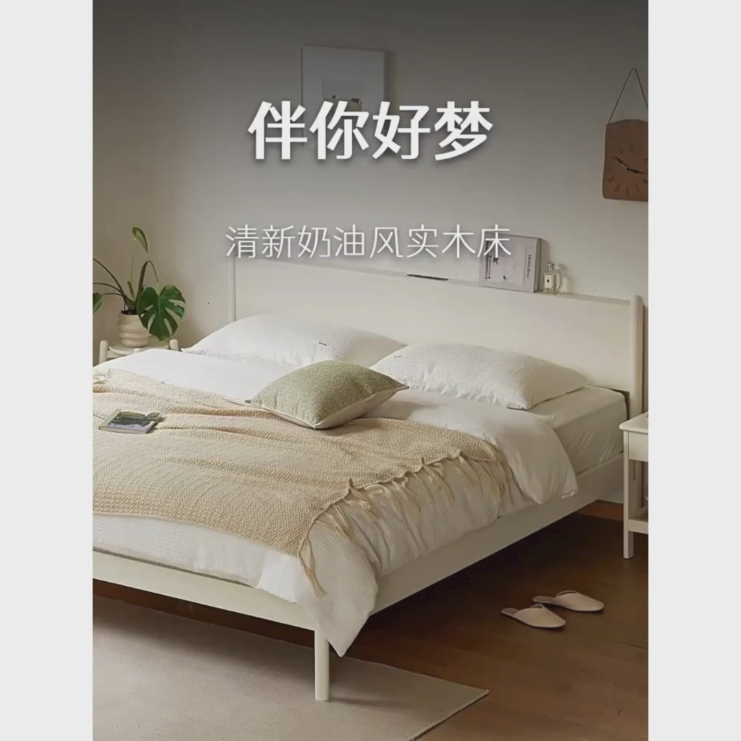 Pine Solid Wood Bed — Nordic Minimalist Cream Style Large Bed