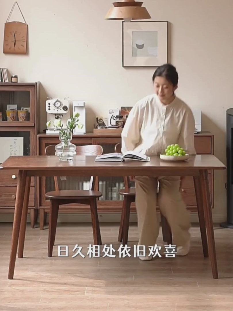 The Classic "Less Is More" This simple dining table is also really beautiful~ Abandon complicated design Only the simple lines and slightly flared slanted legs are visually light and flexible. The low-key and introverted walnut color is full of texture, making your three meals a day more ceremonial
