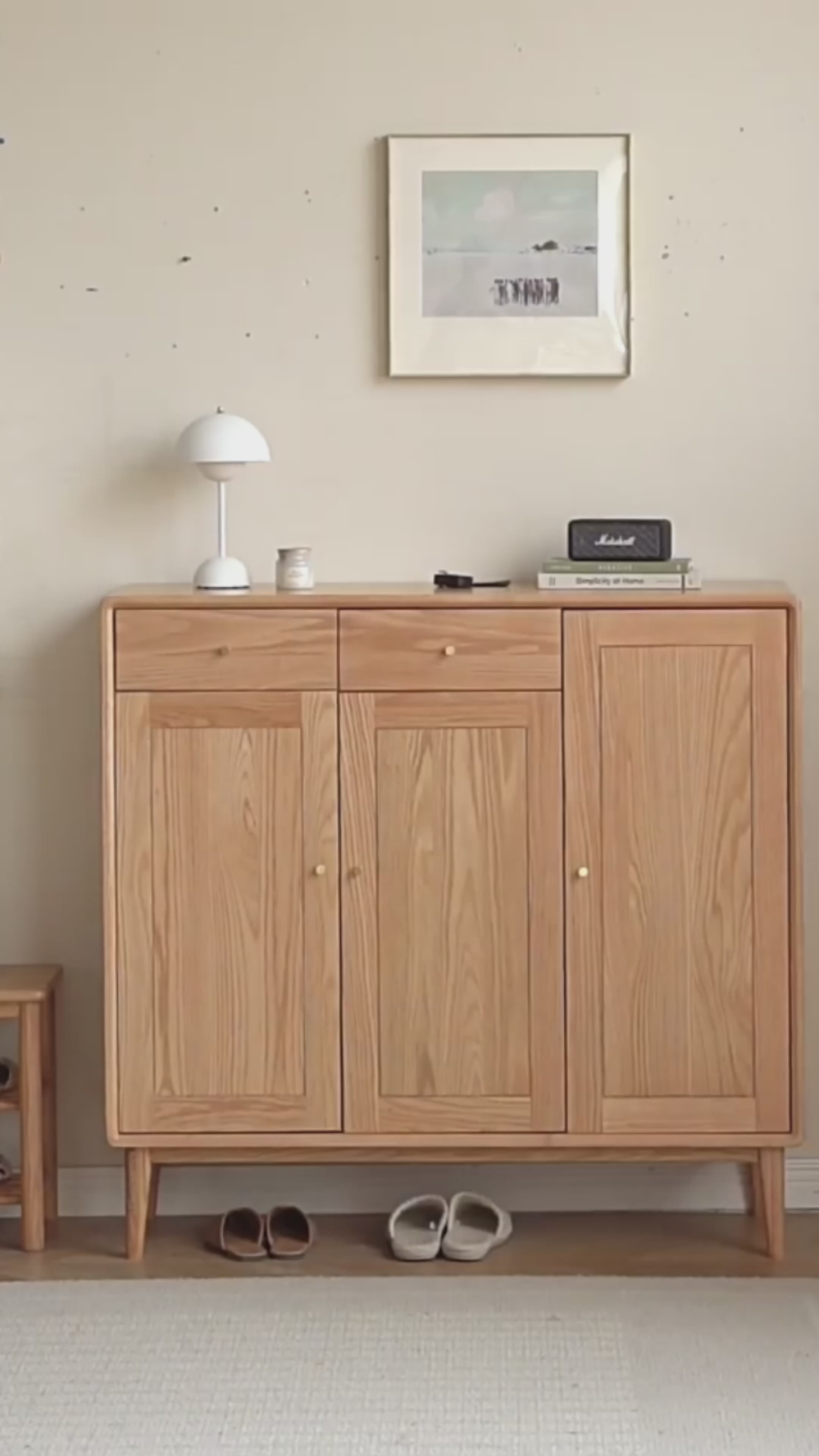 Two and three doors shoe cabinets made of North American FAS grade oak have different hight layers that can be adjusted to your shoe hight. You can store more things on the countertop and double drawstring sundries. Also easy to clean the floor as the cabinet is 15 cm off the floor and has rounded corners.