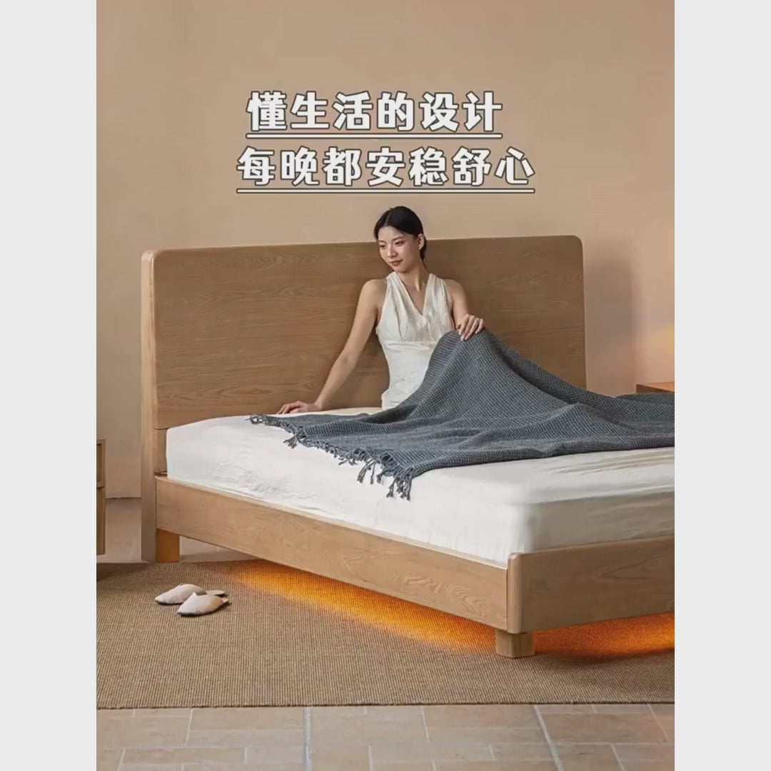Ash Solid Wood Bed — Modern Minimalist Large Slab Design with Luminous Features