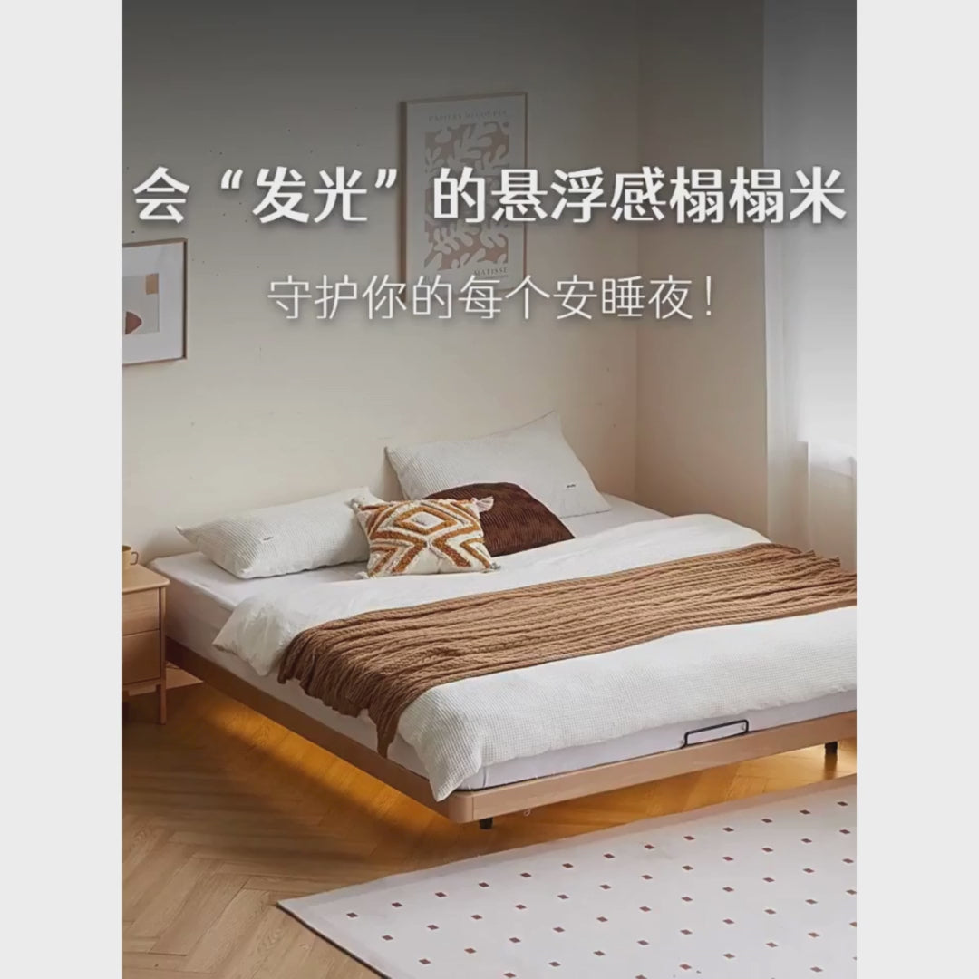 Beech Solid Wood Upholstered Bed — Retro Style with Floating Design, Luminous Light, Luxury Finish