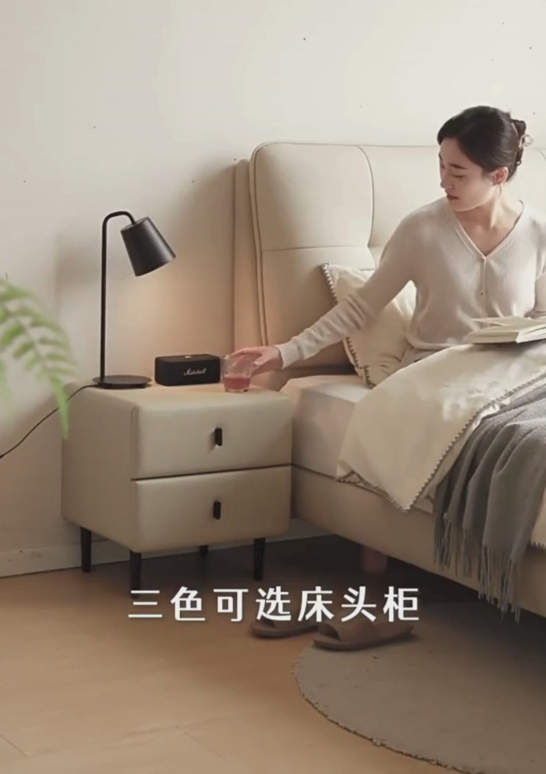 This nightstand features a solid wood exterior made from 100% pure wood, with a pine board frame and paulownia wood drawer. The fabric covering is PVC and not removable or washable. It stands on sturdy iron feet. Delivery and installation are available in over 2000 urban areas nationwide, with some locations requiring additional fees—please contact customer service for details.