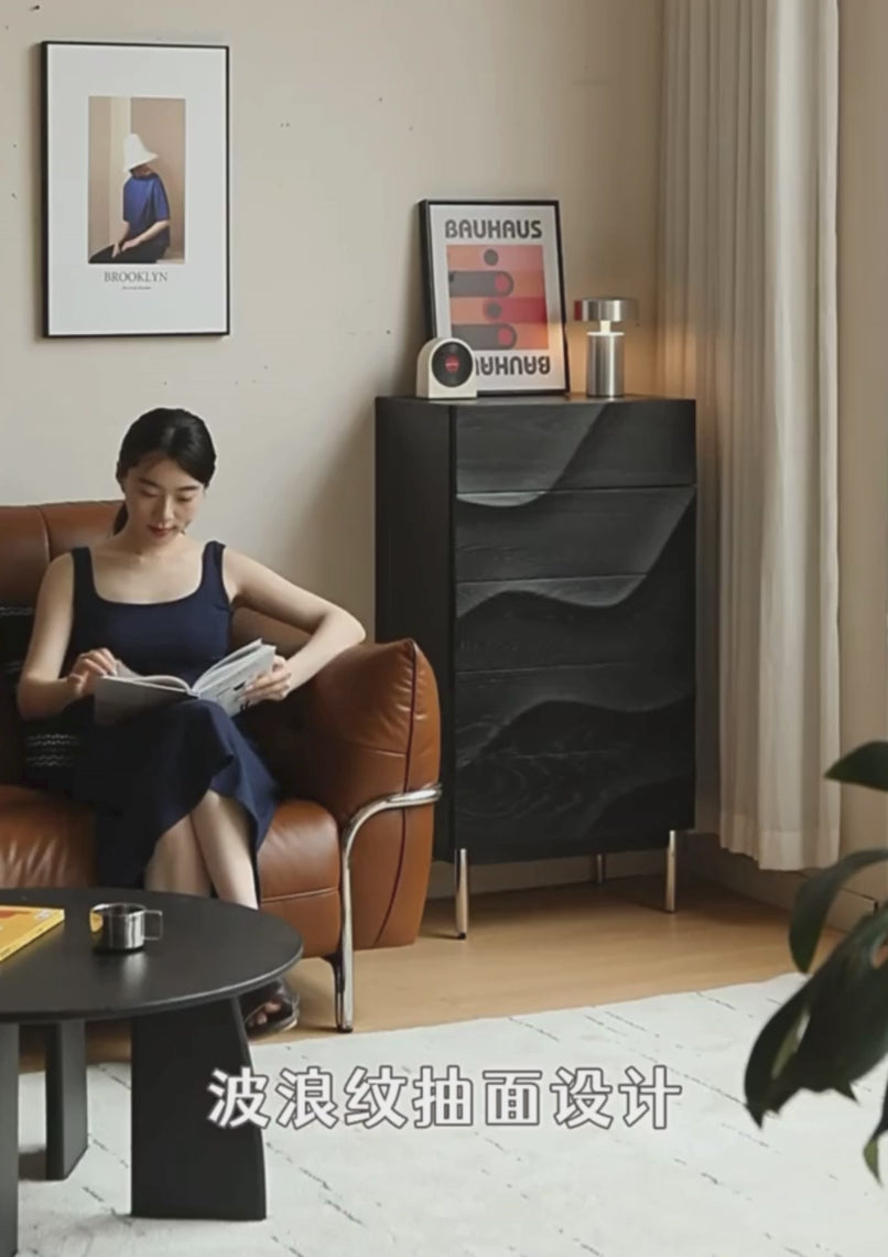 Inspired by ocean waves, this oak solid wood drawer features flowing shapes that bring natural movement to its smoky oak texture, adding vitality while complementing Bauhaus design lines.