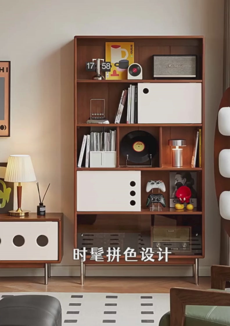 This antique-style bookshelf combines warm white and teak tones, inspired by Medieval Bauhaus design. It adds character and liveliness to any room while providing practical storage for books and decor.