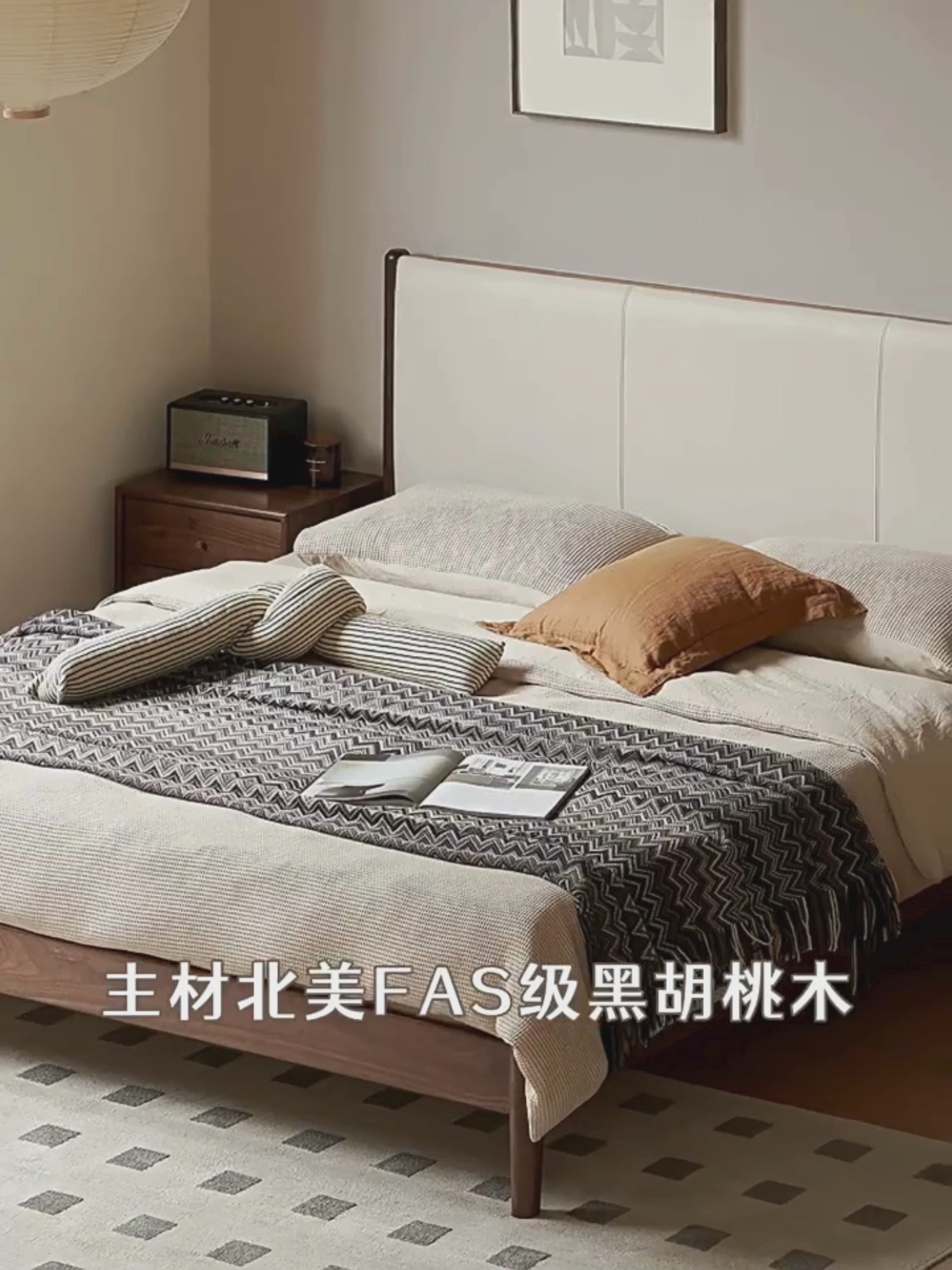 Oak,Black Walnut Solid Wood Top-Grain Cowhide Leather Bed