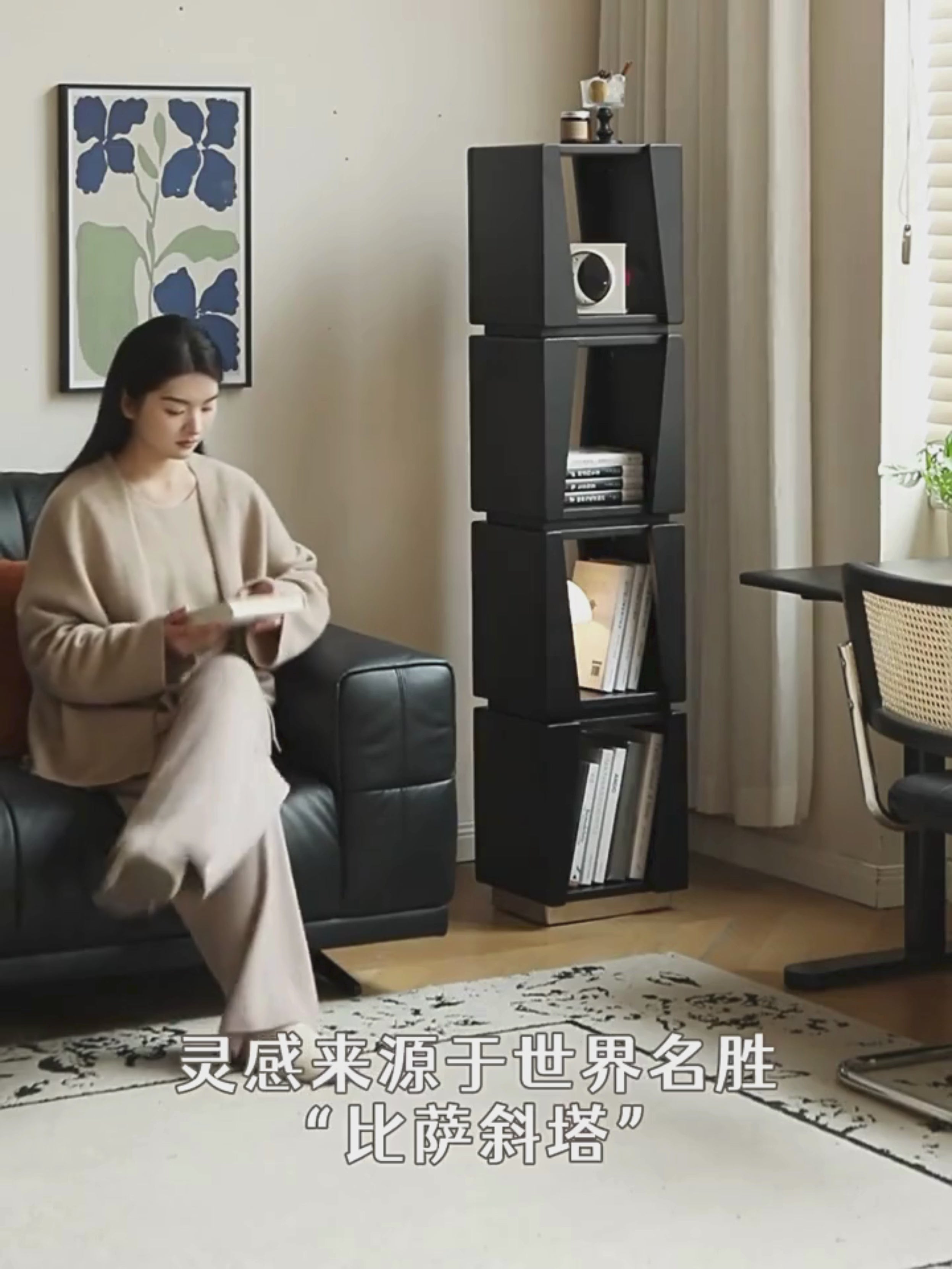 Inspired by the Leaning Tower of Pisa in Italy, the use of parallelogram design not only makes the bookshelf visually inclined, but also creates a home furnishing parallelogram that is more suitable for modern aesthetics. As a kind of geometric shape, it has a simple and bright line beauty.In architectural design, the geometric characteristics of parallelogram can be used to design a simple and powerful architectural appearance.