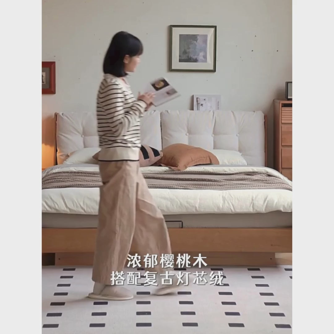 Cherry Solid Wood Box Bed Top Genuine Leather, Corduroy Suspended Bed