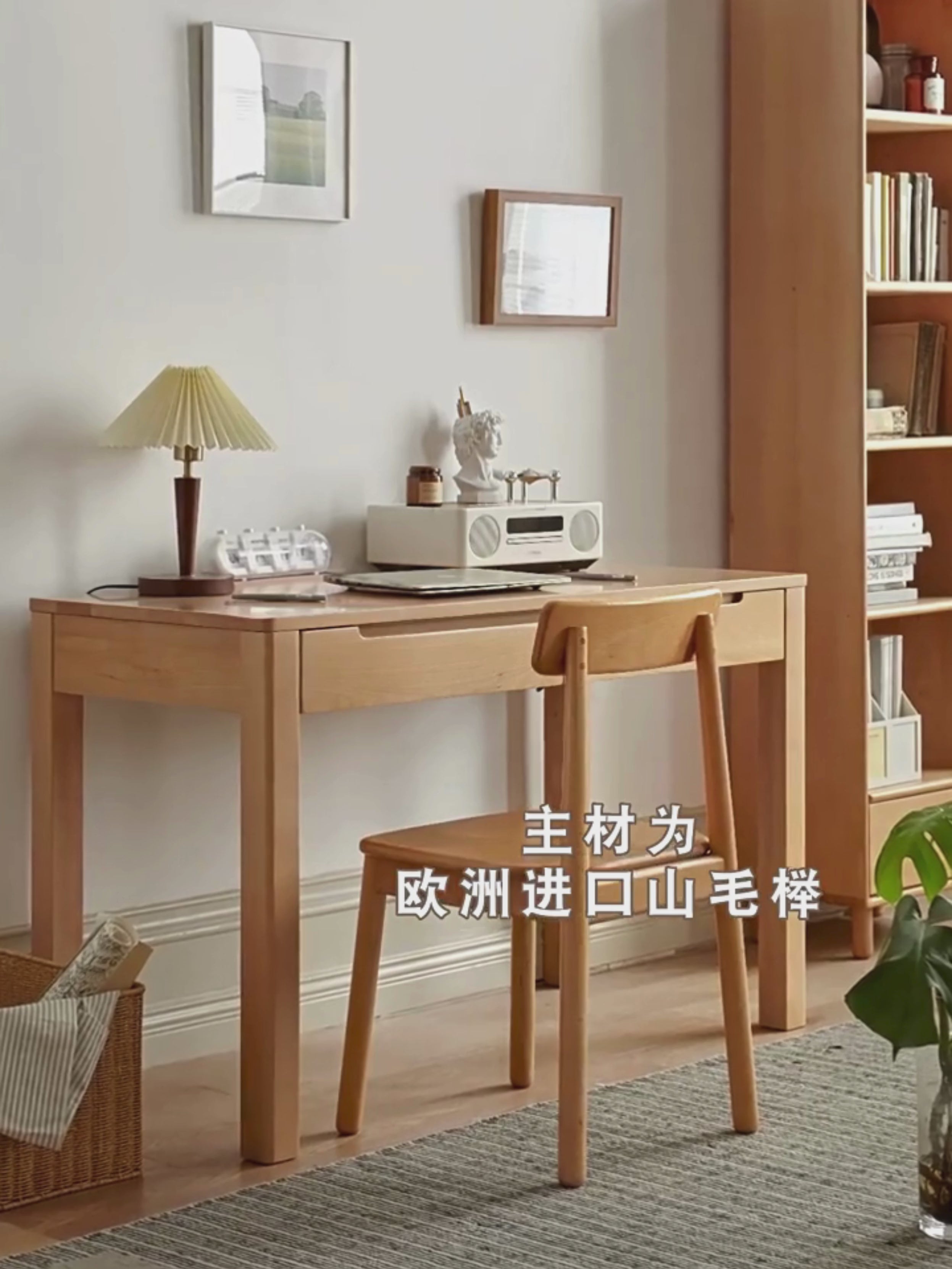 The main material is beech imported from Europe Smooth touch and fine texture The fresh log color is super versatile and the materials are very domineering 6cm*6cm thick solid table legs with 12cm ultra-wide skirt Steady load bearing There will be no shaking when writing.