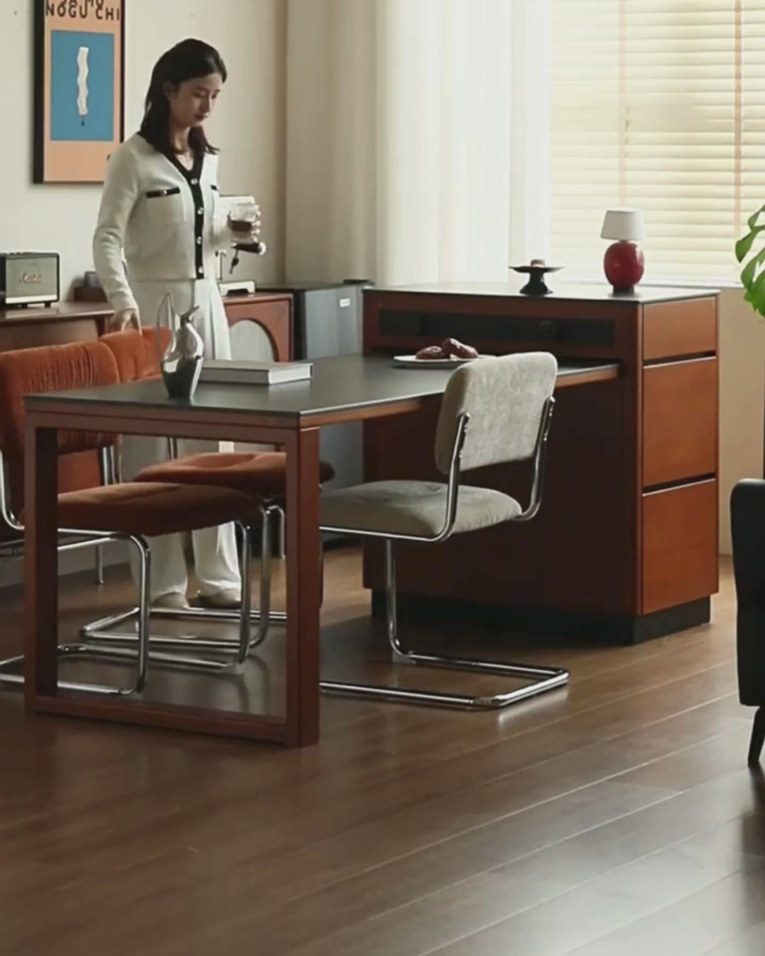 The tabletop of this dining table is crafted from a premium rock slab material, which is a highly durable and innovative surface. Rock slabs are made from natural minerals through high-temperature and high-pressure processing, resulting in a material that is both strong and elegant. This material is scratch-resistant, stain-resistant, and heat-resistant, making it ideal for everyday use while maintaining its beauty over time. The rock slab surface offers a sleek and modern aesthetic, blending seamlessly with the solid wood base to create a timeless and functional design for your dining area.