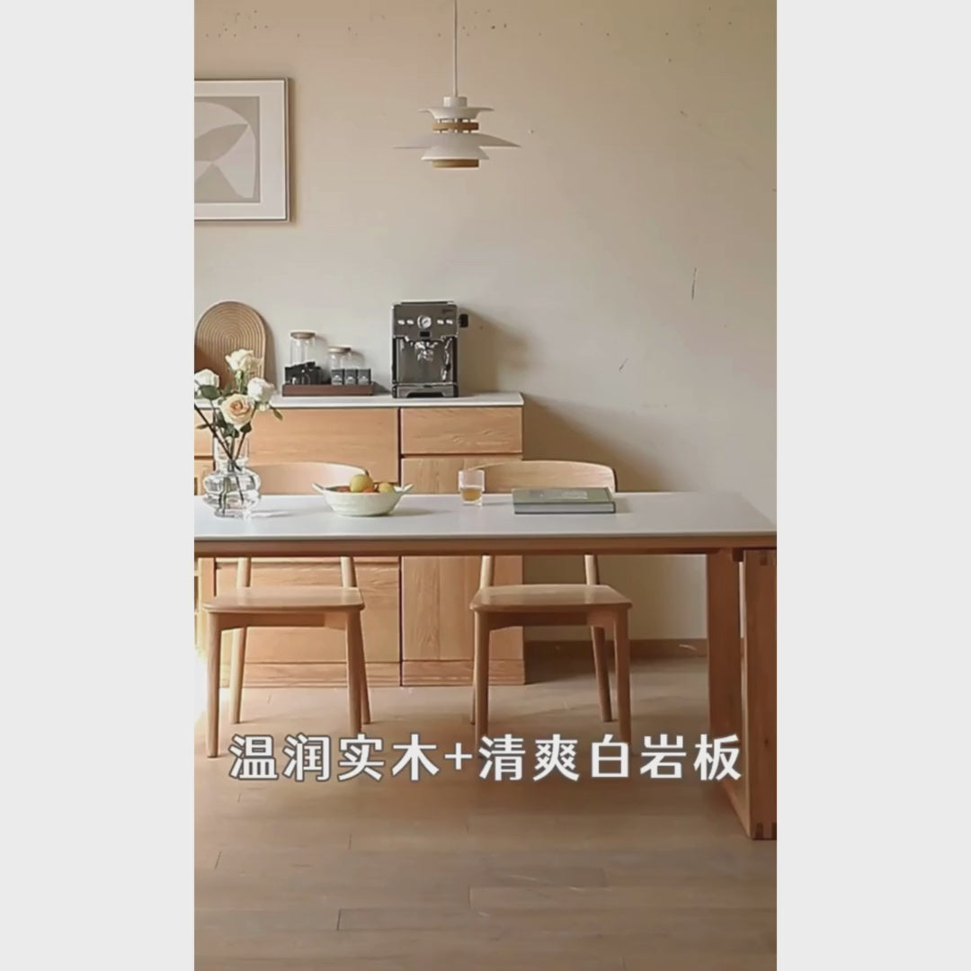 The tabletop of this dining table is crafted from a premium rock slab material, which is a highly durable and innovative surface. Rock slabs are made from natural minerals through high-temperature and high-pressure processing, resulting in a material that is both strong and elegant. This material is scratch-resistant, stain-resistant, and heat-resistant, making it ideal for everyday use while maintaining its beauty over time. The rock slab surface offers a sleek and modern aesthetic, blending seamlessly with the solid wood base to create a timeless and functional design for your dining area.
