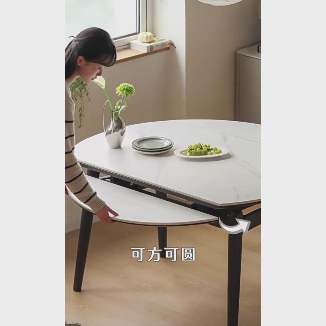 The oak smoky swallow-colored rock slab dining table is easy to fold, and the large round table that can be owned in a small space with a variable radius. The soft-gloss rock slab desktop is scratch-resistant, oil-resistant, and impermeable. It is easy to take care of. The oak smoky swallow-colored frame is solid and stable to support the desktop, and the work surface is not visible.