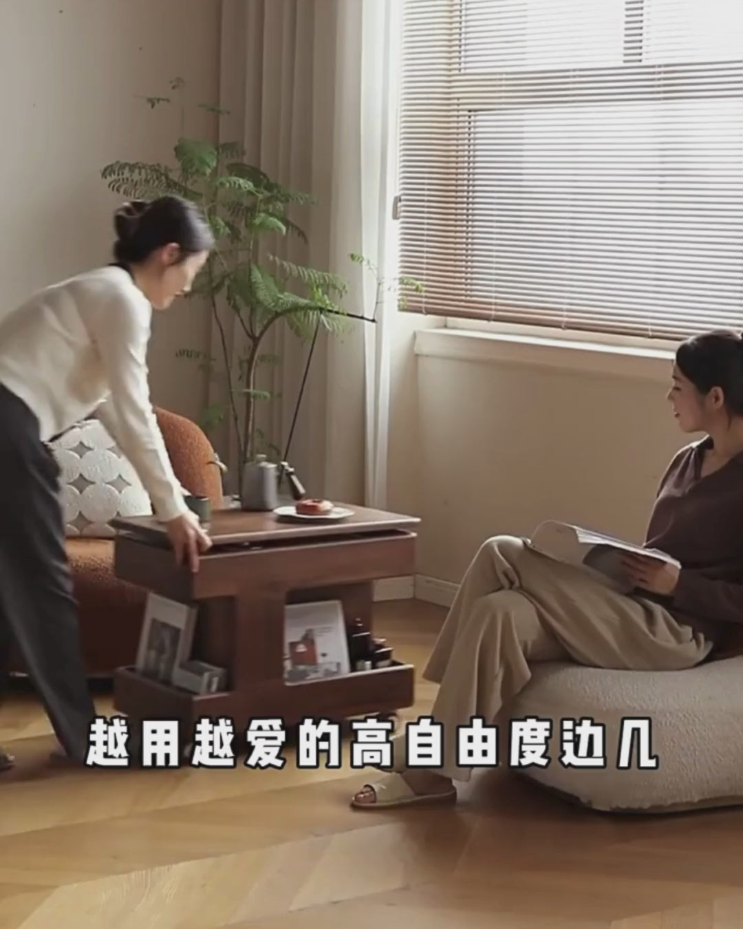 Black Walnut, Teak Solid Wood Raised and Lowered Rotating Coffee Table.