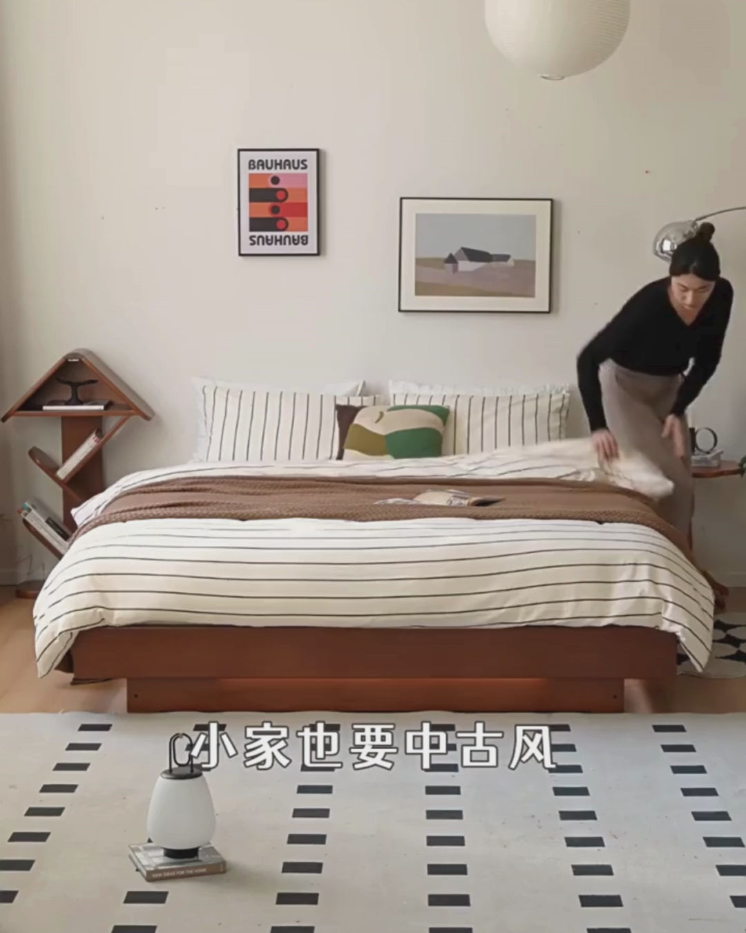 Poplar Solid Wood Retro Platform Box Bed, Headboard-Free Bed with light.