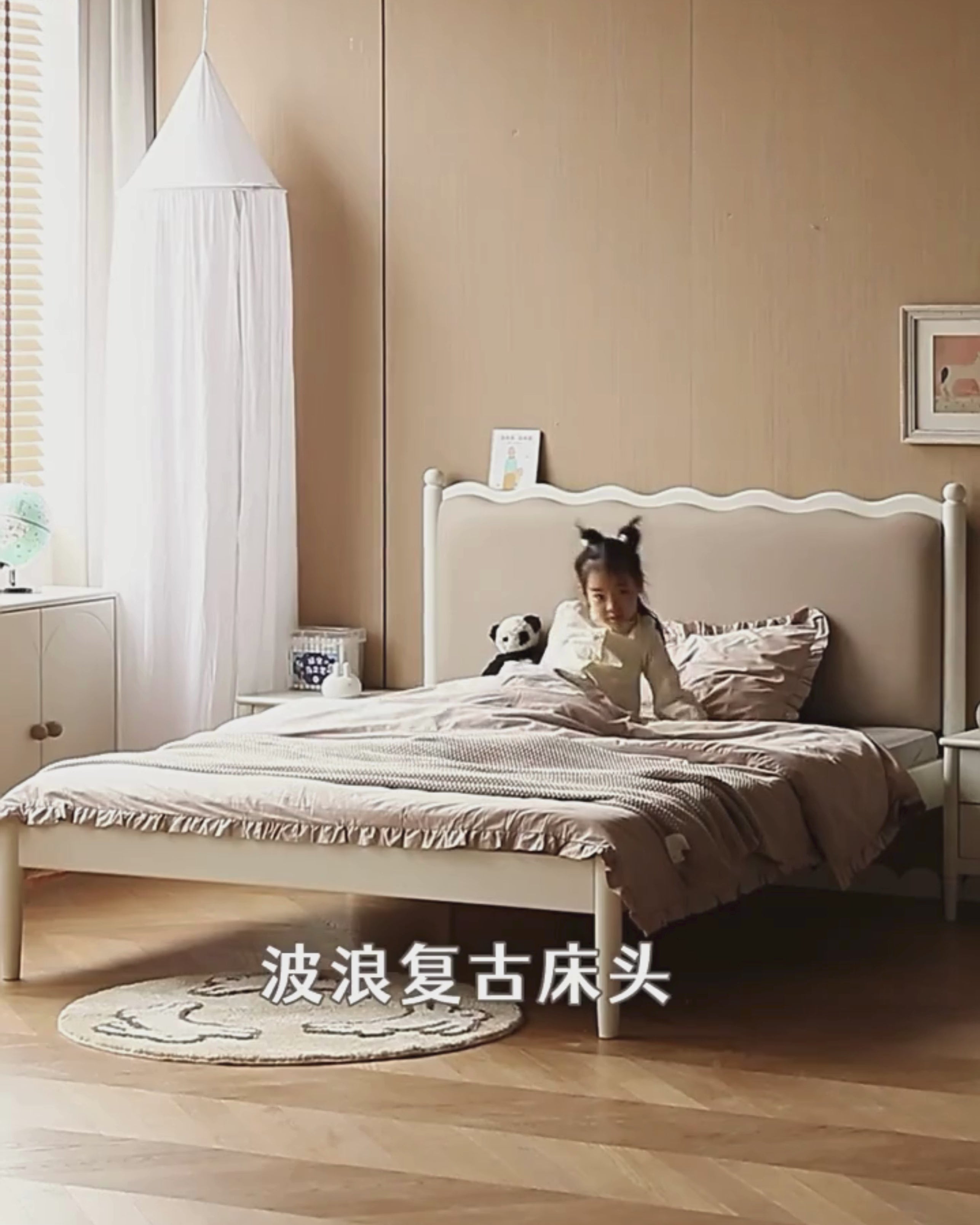 Rubber Wood Children's Bed with organic leather Cream Style.