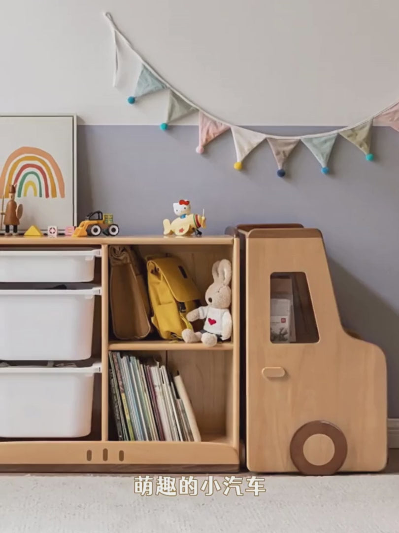 Car styling, your child's new playmate The cute car is integrated with the all-solid wood cabinet. While the design is full, it is full of childlike fun, and it is easier to inspire children to learn to store independently.