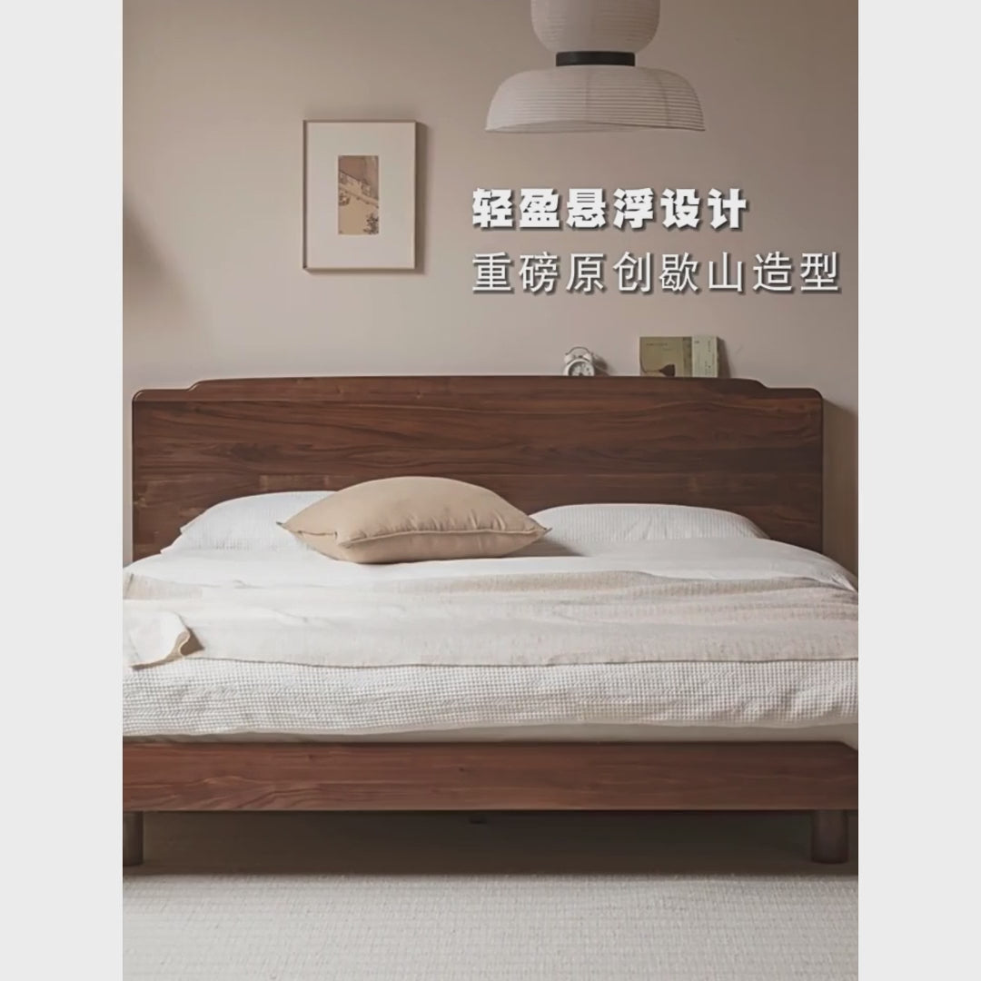 Black Walnut, Ash Solid Wood Big Bed with Light