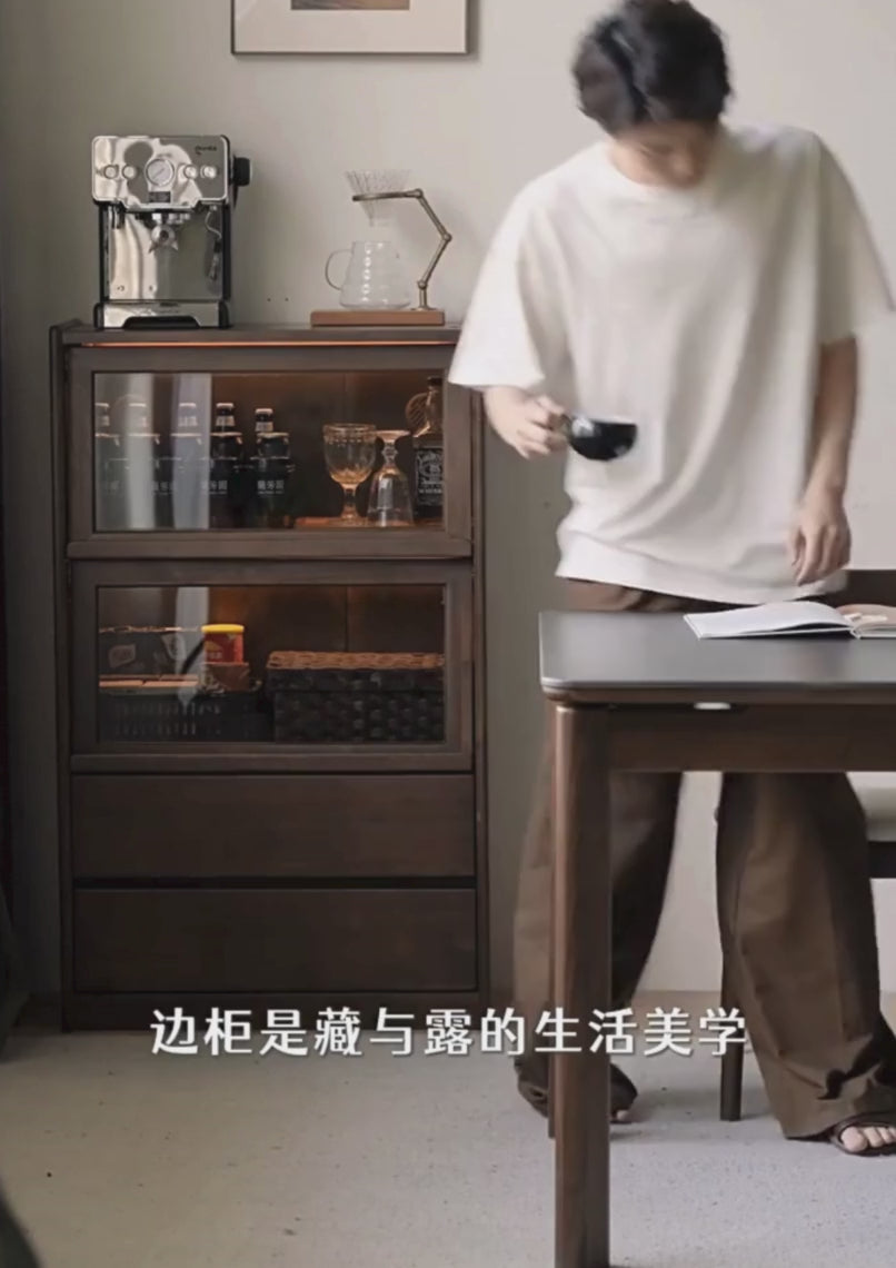 Crafted from 100% pure North American black walnut, this side cabinet features rich, natural patterns with minimal knots, ensuring durability and luxury. Its structure includes corrosion-resistant paulownia wood for the back and boxes, and FAS-grade smoky black oak for support, both chosen for stability and wear resistance. Equipped with smooth three-section steel ball slide rails and 5mm flat gray glass sliding doors, it combines functionality with modern design. The cabinet also includes a 12W touch-switch aluminum trough lamp with a 1.5-meter power cord, providing practical lighting. Solid wood construction offers a natural, healthy, and long-lasting piece.