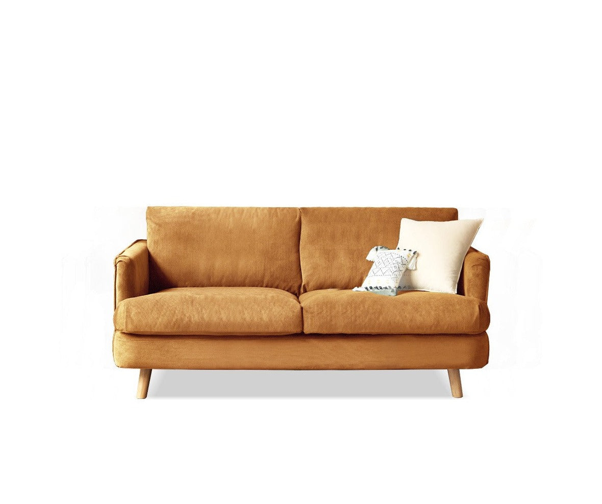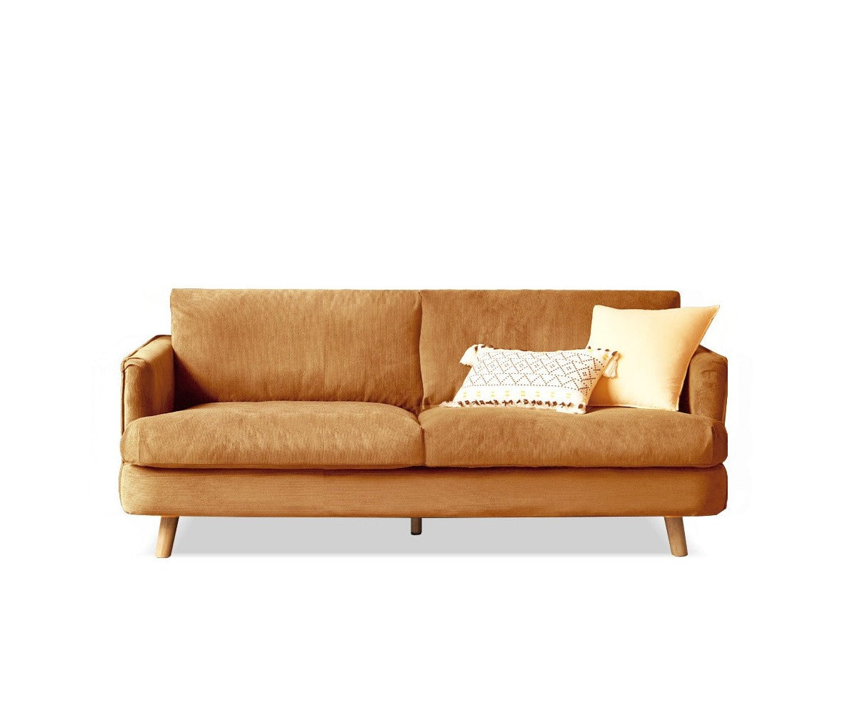 This sofa features a velvet or eco-friendly fabric with ash wood legs. Its frame is made from larch wood, combined with serpentine springs and elastic for support. The cushions contain pearl cotton, down, and high-resilience sponge for comfort.