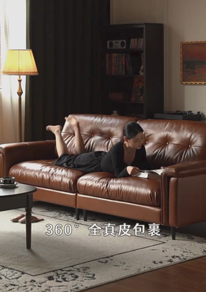 This American retro-style sofa features a sturdy pine wood frame with layered solid wood and serpentine springs for lasting support. Its iron legs ensure stability, while high-rebound sponges provide comfortable cushioning. Upholstered in durable mocha brown full leather with oil wax finish, the sofa offers a classic look. The seat cushion is fixed and non-removable, designed for easy assembly with an insert connection method.