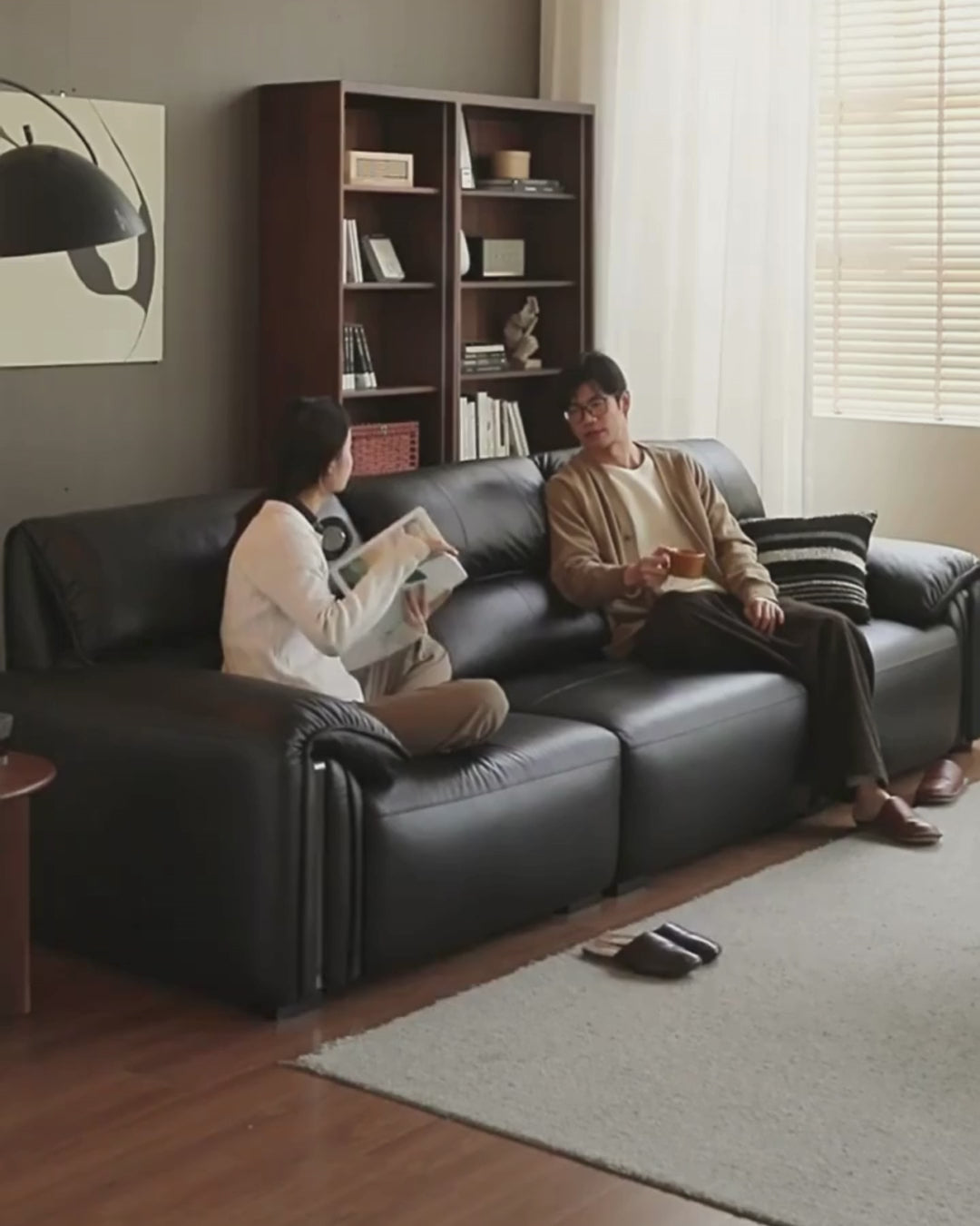 Leather Italian Light Luxury Black Straight Line Sofa.