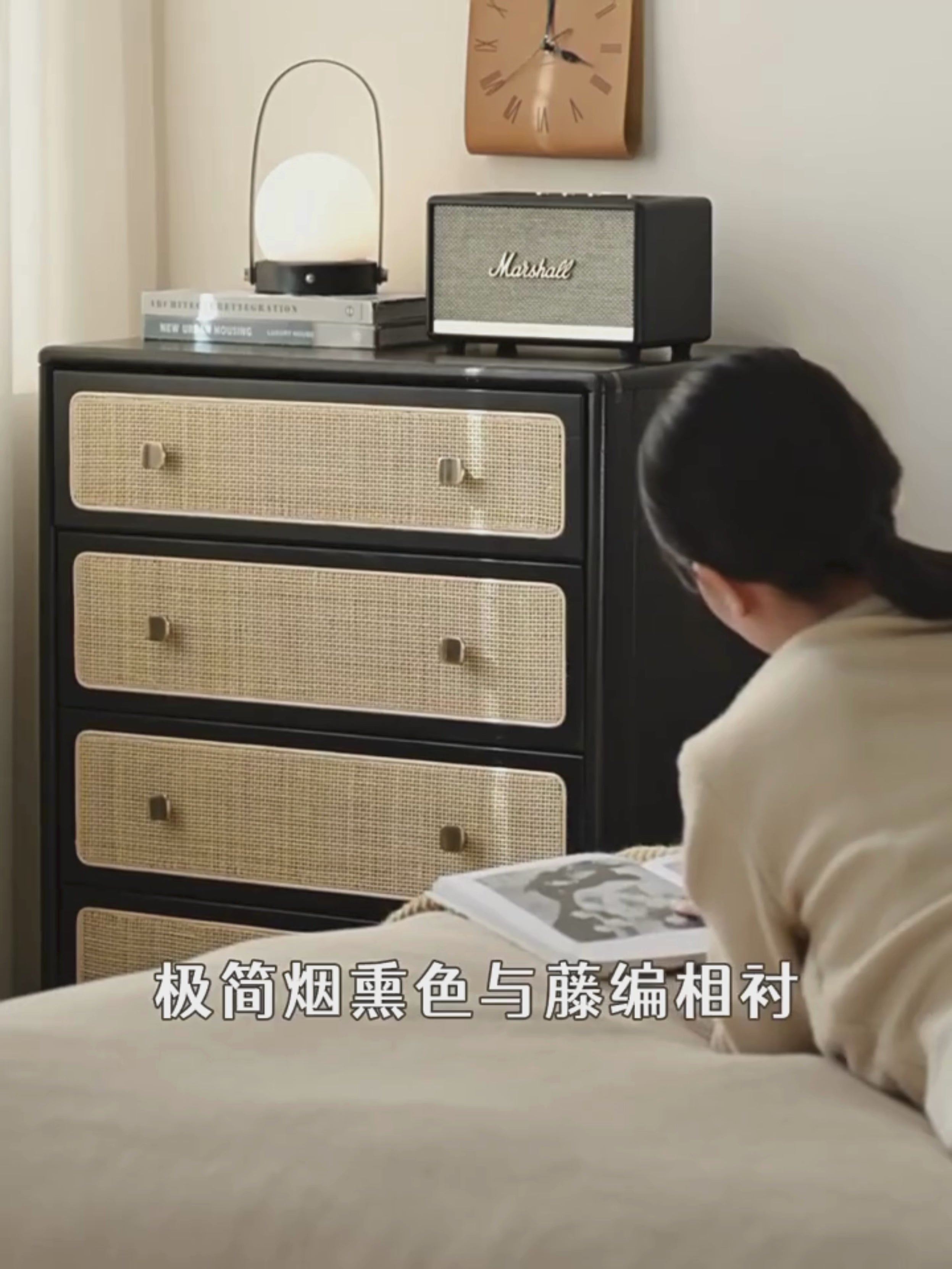 Oak Solid Wood Cabinet Modern Rattan Four Drawers.