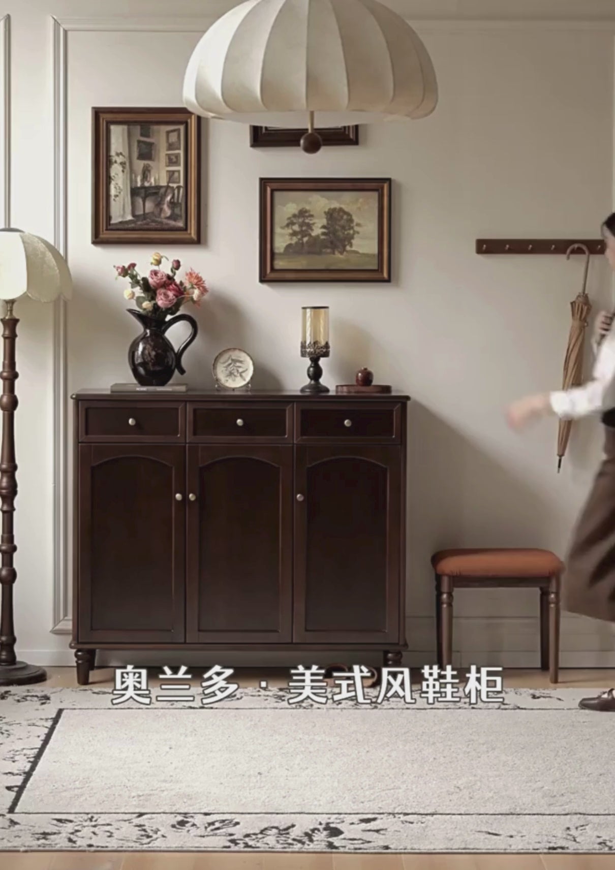 This Poplar Solid Wood Shoe Cabinet combines classic American retro style with design suited to Chinese aesthetics. It offers spacious, partitioned storage for shoes and everyday items, helping keep your entryway neat and welcoming. Its elegant look adds warmth and organization to your home environment.
