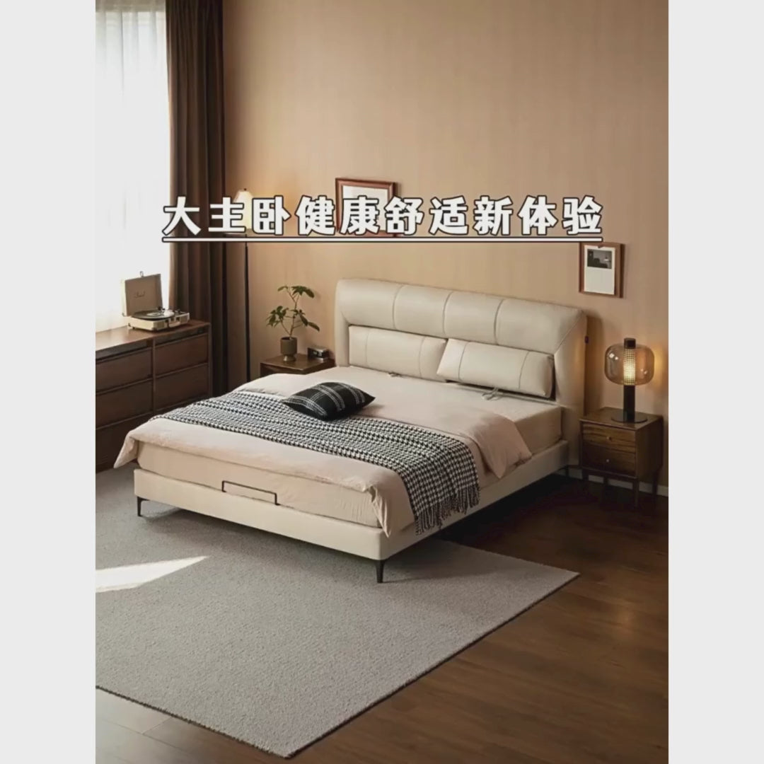 Oak Solid Wood Bed Modern Genuine Leather,Technology Cloth, Fabric