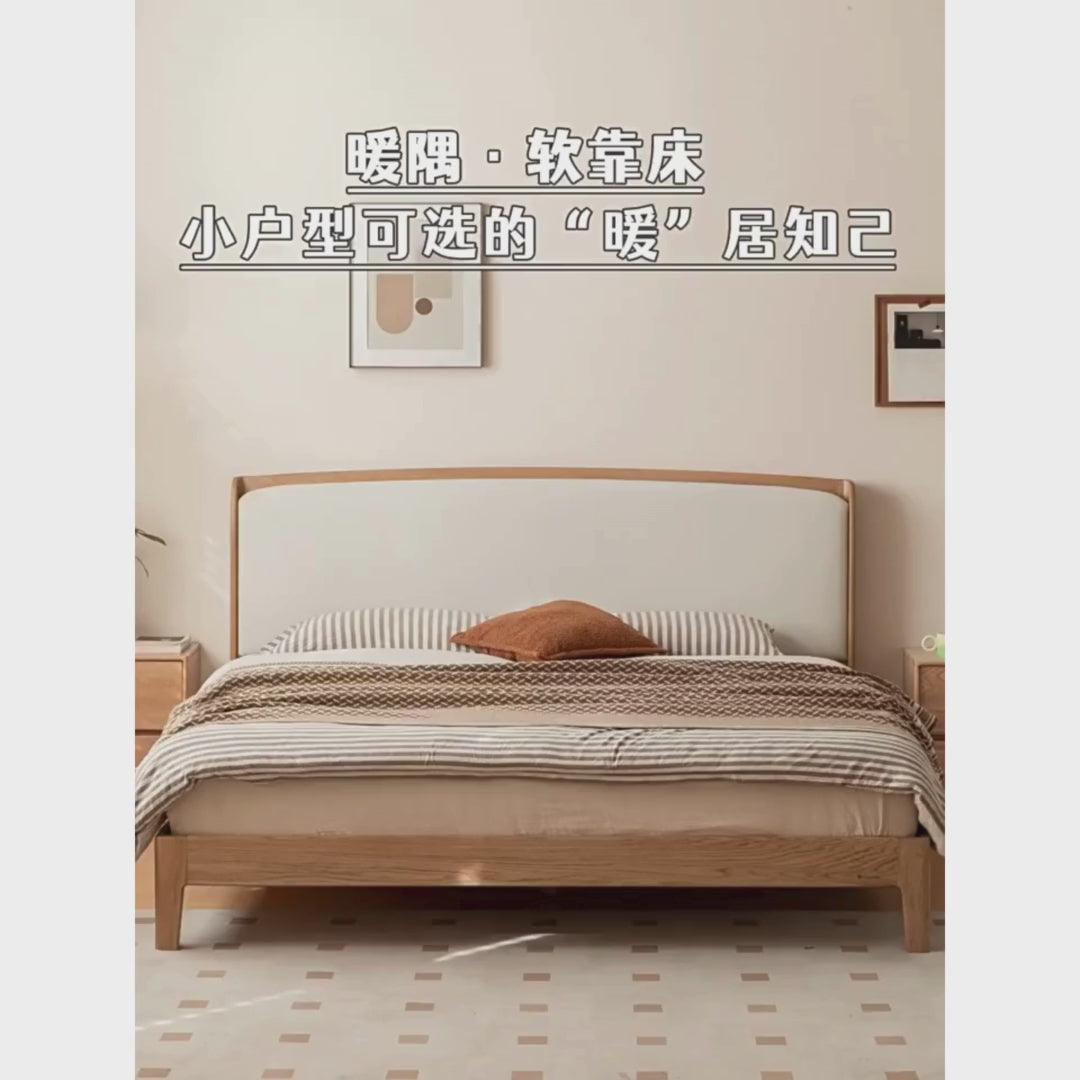 Oak Solid Wood Bed — Modern Minimalist, Genuine Leather Upholstered Bed