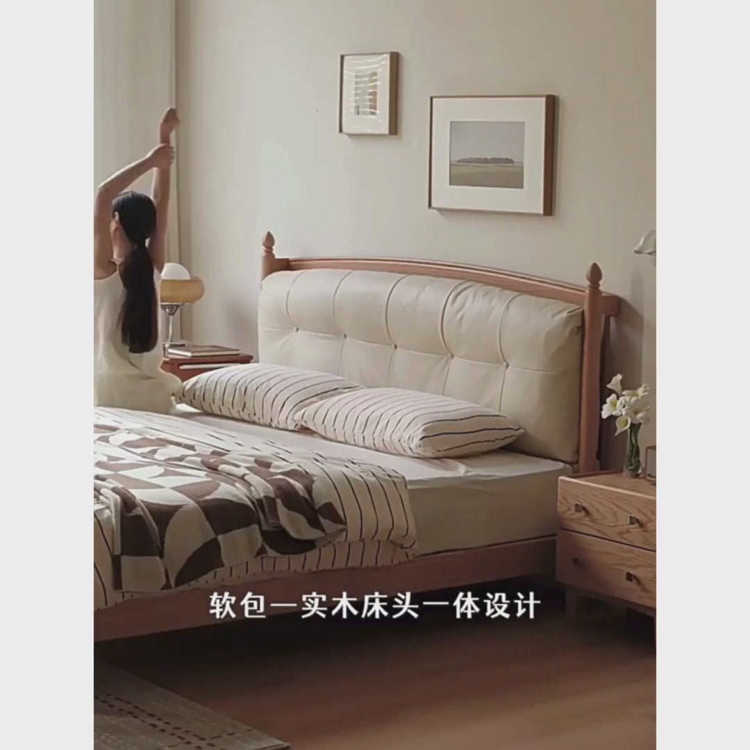 Oak Solid Wood Bed — Modern Minimalist with Genuine Leather and Soft Headboard