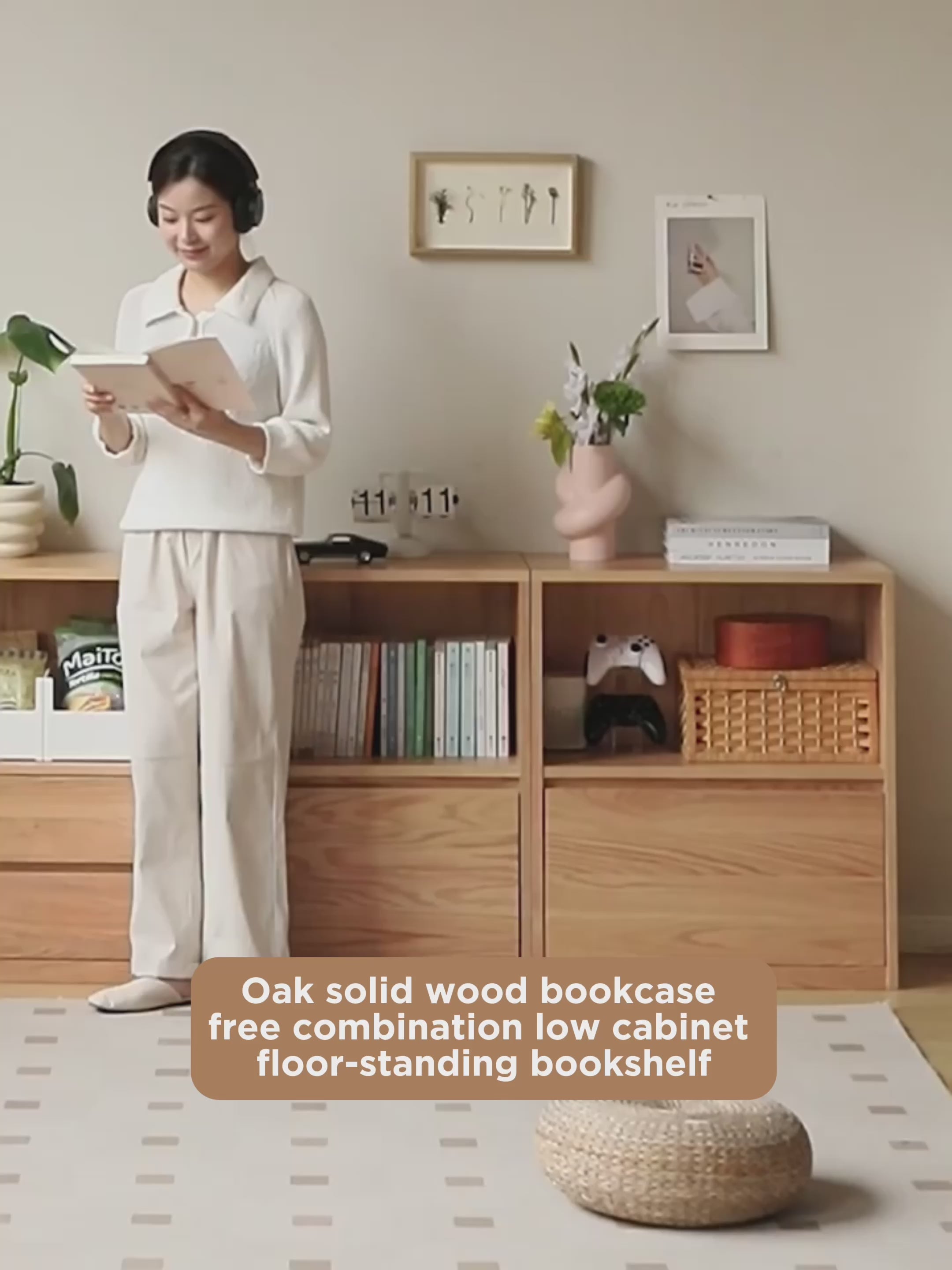 Oak, Solid Rubberwood, Ash Solid Wood Bookcase Free Combination Low Cabinet Floor-Standing Bookshelf