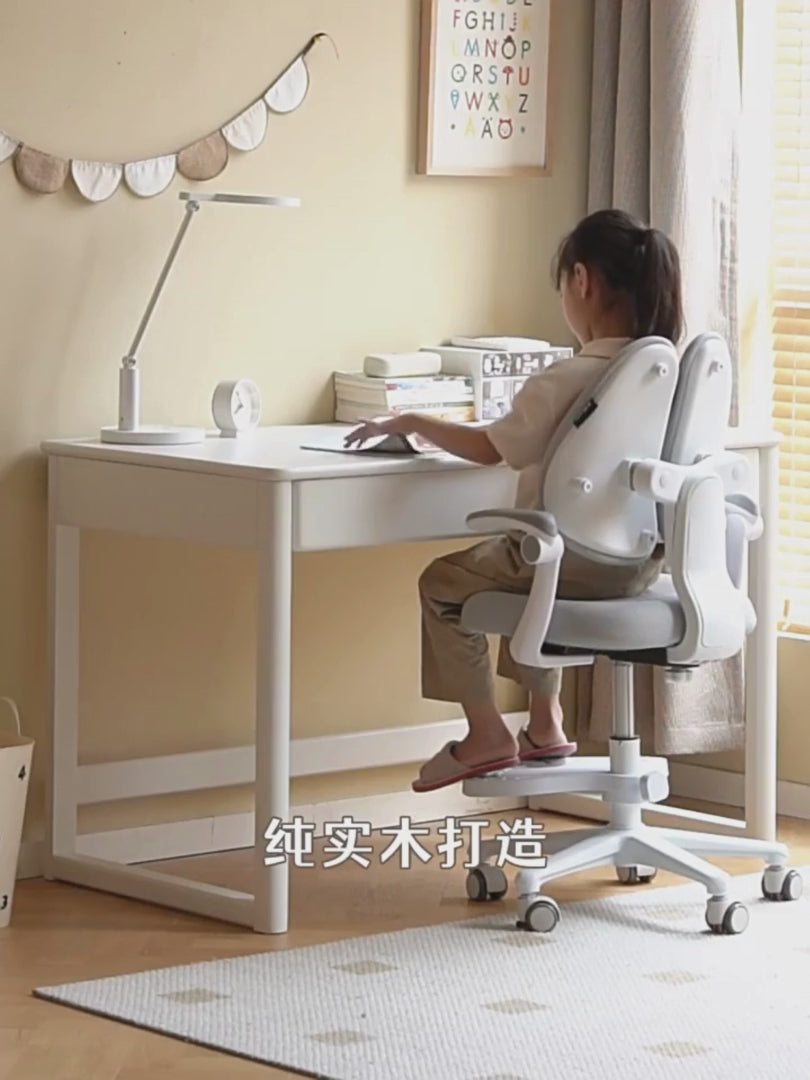 Create a quiet and focused learning space for children ① Pure solid wood veneer Environmentally friendly and durable materials ②Spacious and large desktop 65cm depth, learning is not cramped ③The back shape stabilizes the table legs Safer learning and more focused ④ Practical double-drawer storage, easy to find odds and ends ⑤ Simple and versatile, quiet study Applicable to multiple styles, from small to large